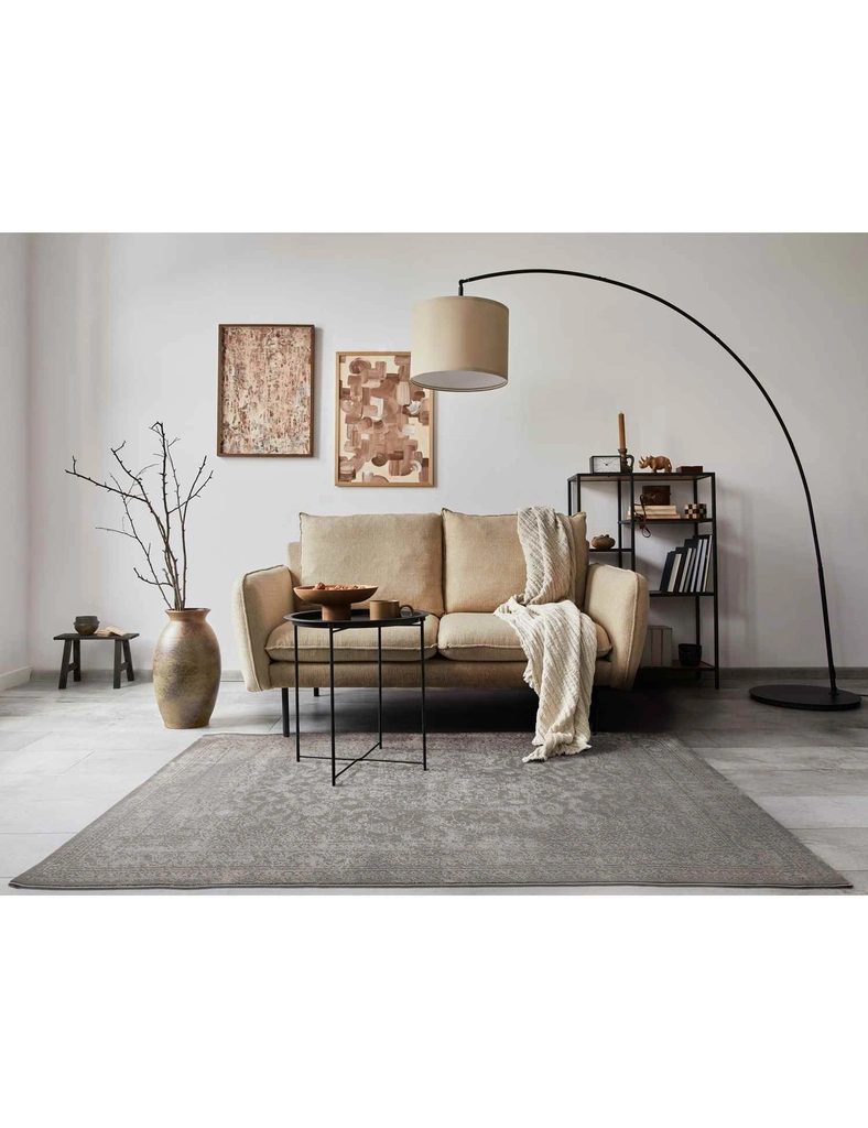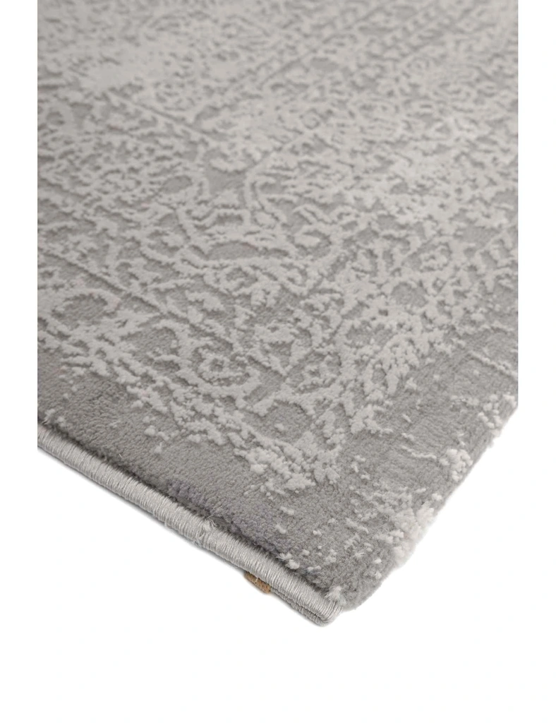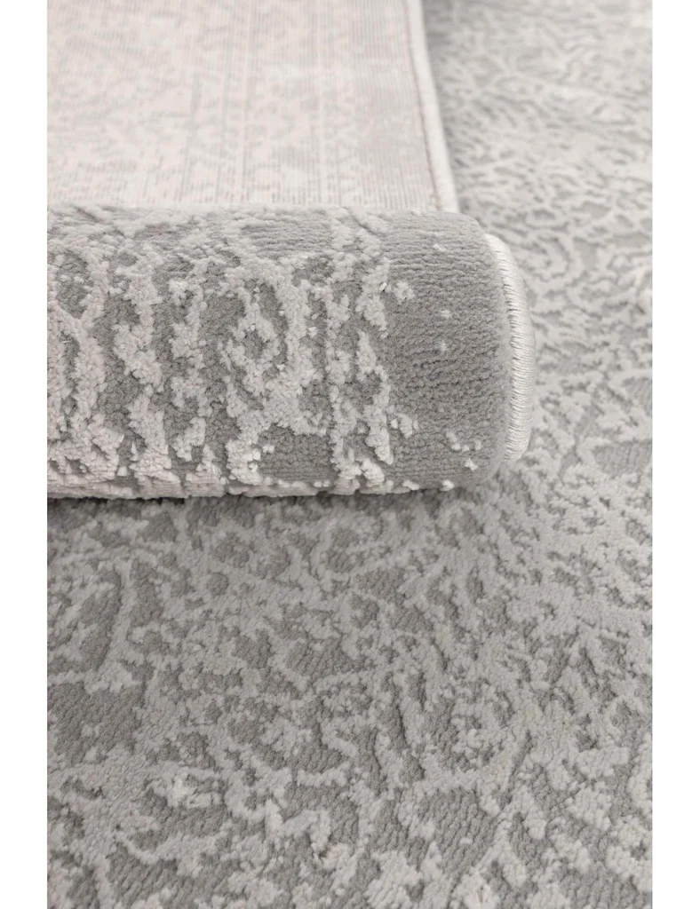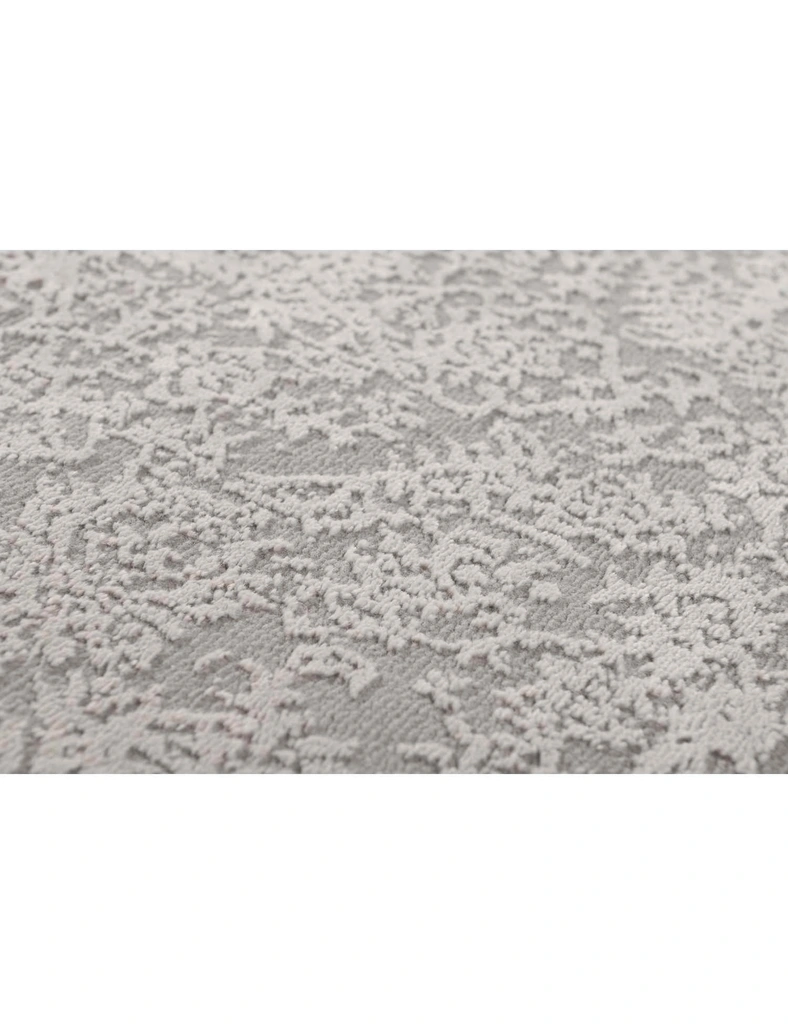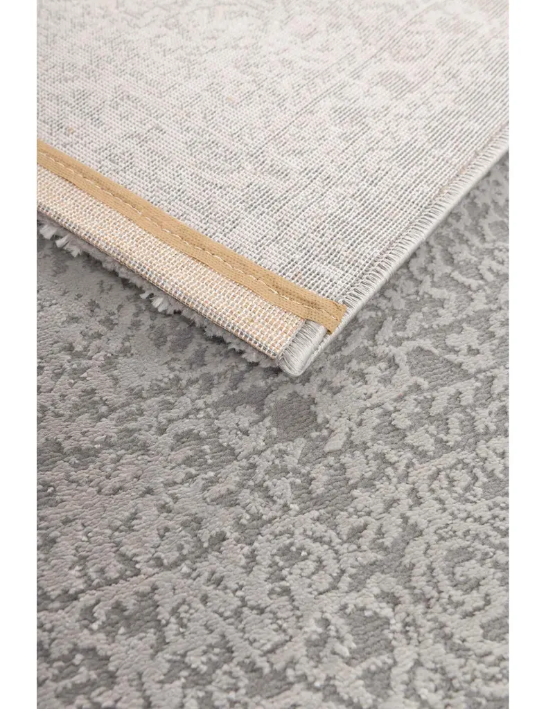 Wykonany z poliestru, dzięki czemu ma miękkie i przyjemne w dotyku runo. Delikatny, orientalny, klasyczny wzór na szarym tle, z subtelnymi, nieregularnymi przebarwieniami nadającymi mu naturalny, lekko postarzały charakter.
