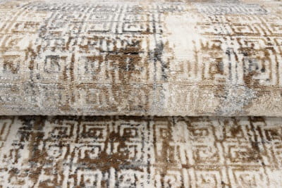 Miękki i przyjemny w dotyku dywan w ciepłych odcieniach, ozdobiony geometrycznym greckim wzorem meandrów, które układają się w równomierne rzędy na delikatnie przecieranym tle z efektem postarzenia. Jego stylowy design świetnie komponuje się z różnorodnymi stylami wnętrz, dodając im elegancji i charakteru.