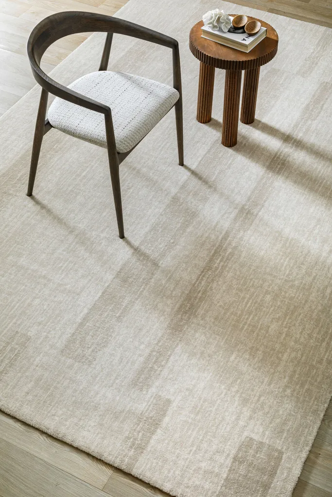 Elegancki dywan w jasnych tonacjach beżu z subtelnym, pionowym wzorem przypominającym przecierki. Wytkany z wysokogatunkowej wełny nowozelandzkiej z gęstym i wysokim runem co gwarantuje najwyższy komfort użytkowania.