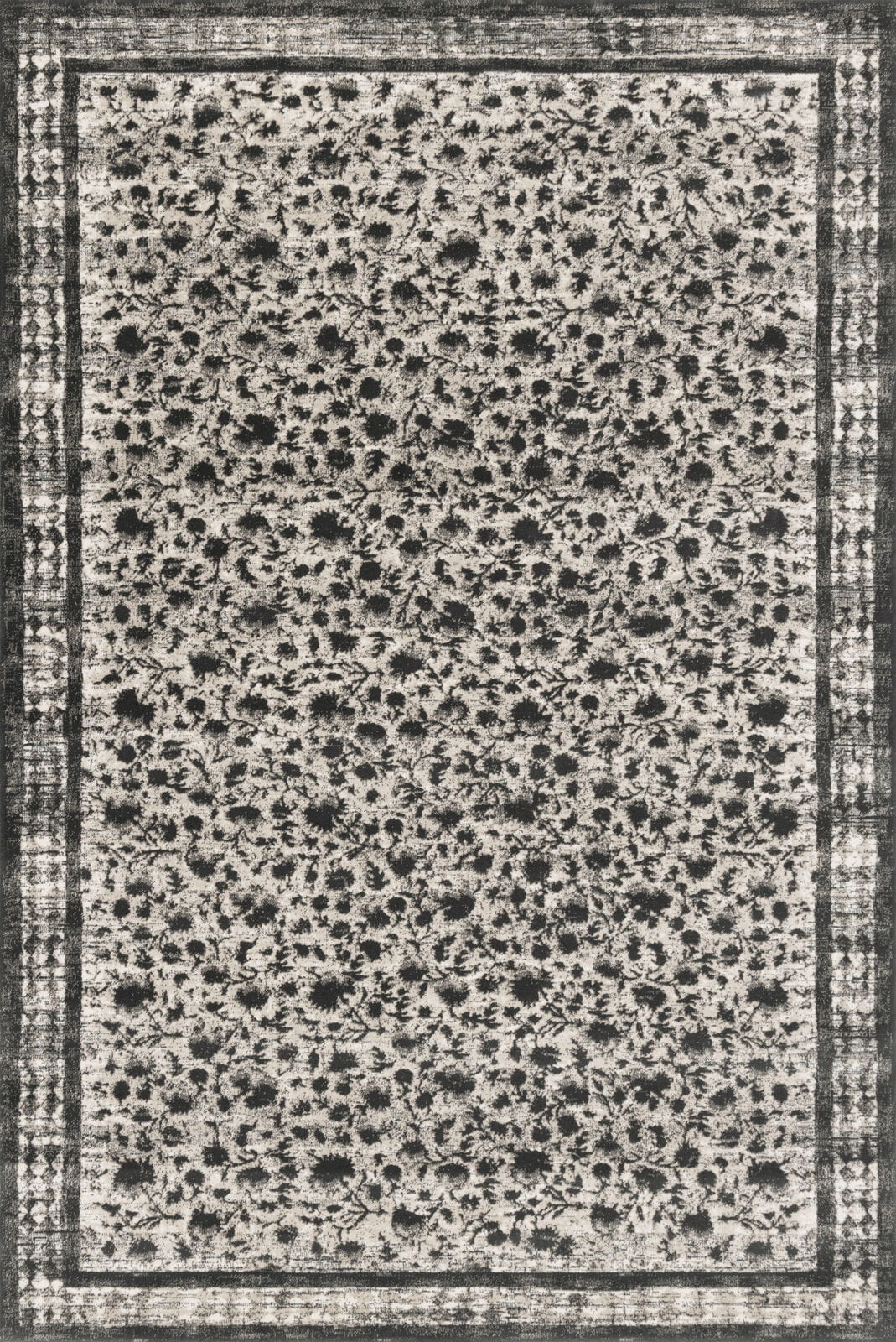 Dywan z delikatnie przecieranym, kwiatowym wzorem i geometryczną ramką w odcieniach szarości. Wytkany z wysokogatunkowej wełny nowozelandzkiej, z gęstym i wysokim runem, zapewnia najwyższy komfort użytkowania.
