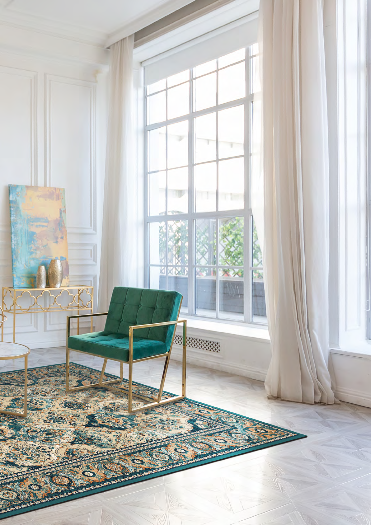 Dywan wykonany z najwyższej jakości wełny owczej, jest trwały i łatwy w utrzymaniu czystości. Inspirowany jest motywami orientalnymi ze wzorami układającymi się w koniczynę marokańską. Wielobarwna kolorystyka z przewagą ciemnej zieleni, doda wnętrzu charakteru i wyjątkowego uroku.