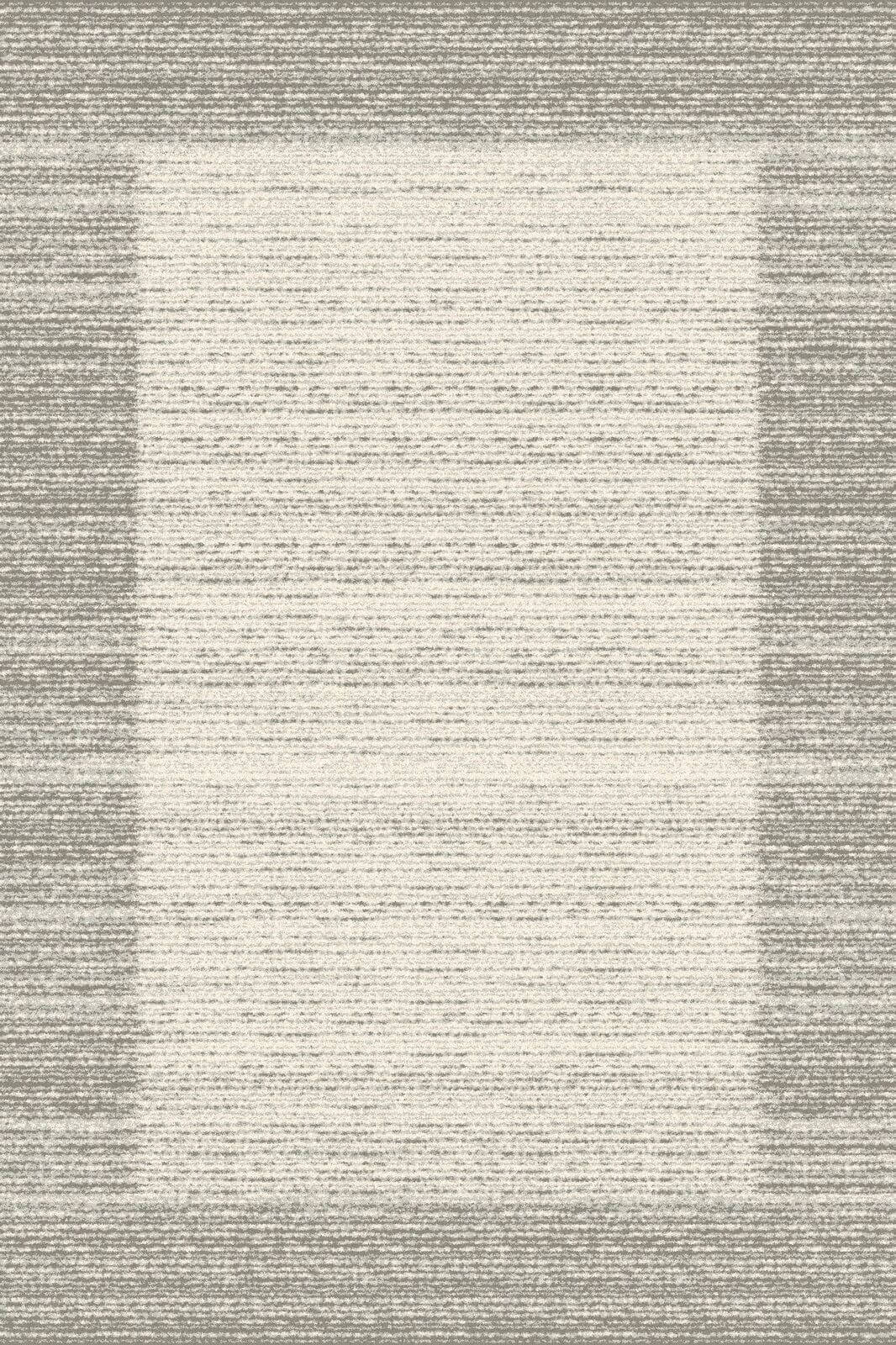 Szary, nowoczesny dywan z gładkim środkiem, otoczonym elegancką prostą ramką, całość dywanu subtelnie przetarta. Wyprodukowany z wysokiej jakości wełny, której zawdzięcza miękkość i trwałość.