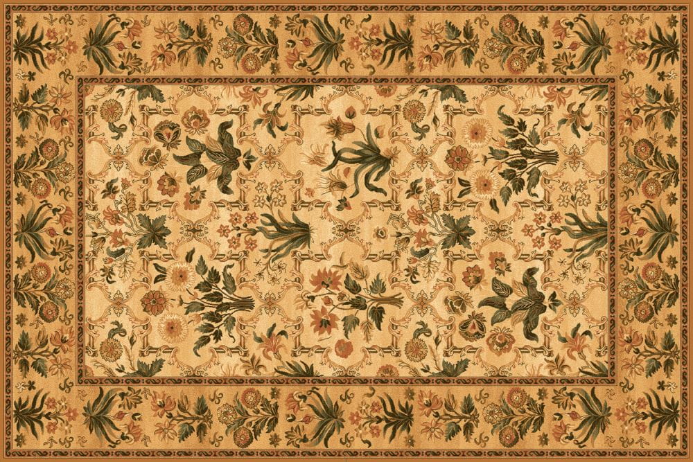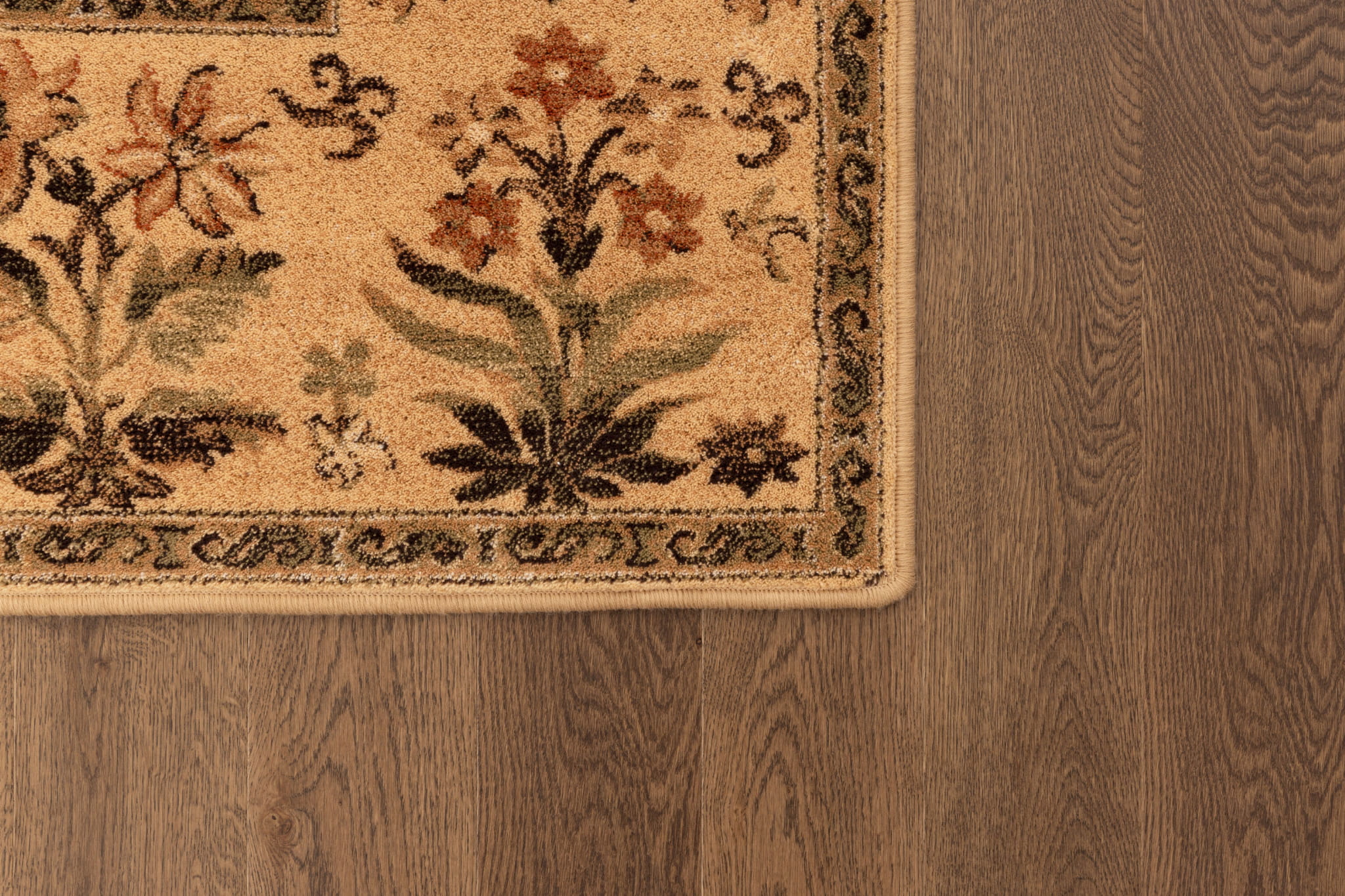 Ciemno-beżowy dywan wykonany z wysokiej jakości wełny owczej, która gwarantuje trwałość i miękkość. Elegancki wzór inspirowany motywami roślinnymi, z dekoracyjną bordiurą okalającą dywan.