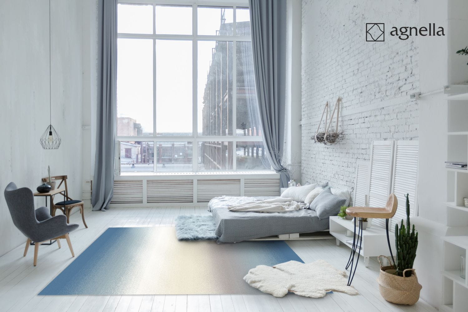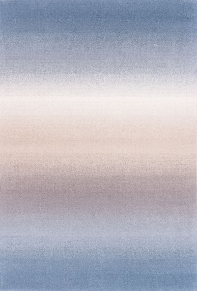 Dywan w nowoczesnym stylu, beżowo-niebieski, z charakterystycznym przejściem kolorystycznym ombre, wykonany z najwyższej jakości wełny owczej. Dywan jest bezpieczny dla zdrowia, do użytku domowego i w obiektach użyteczności publicznej.