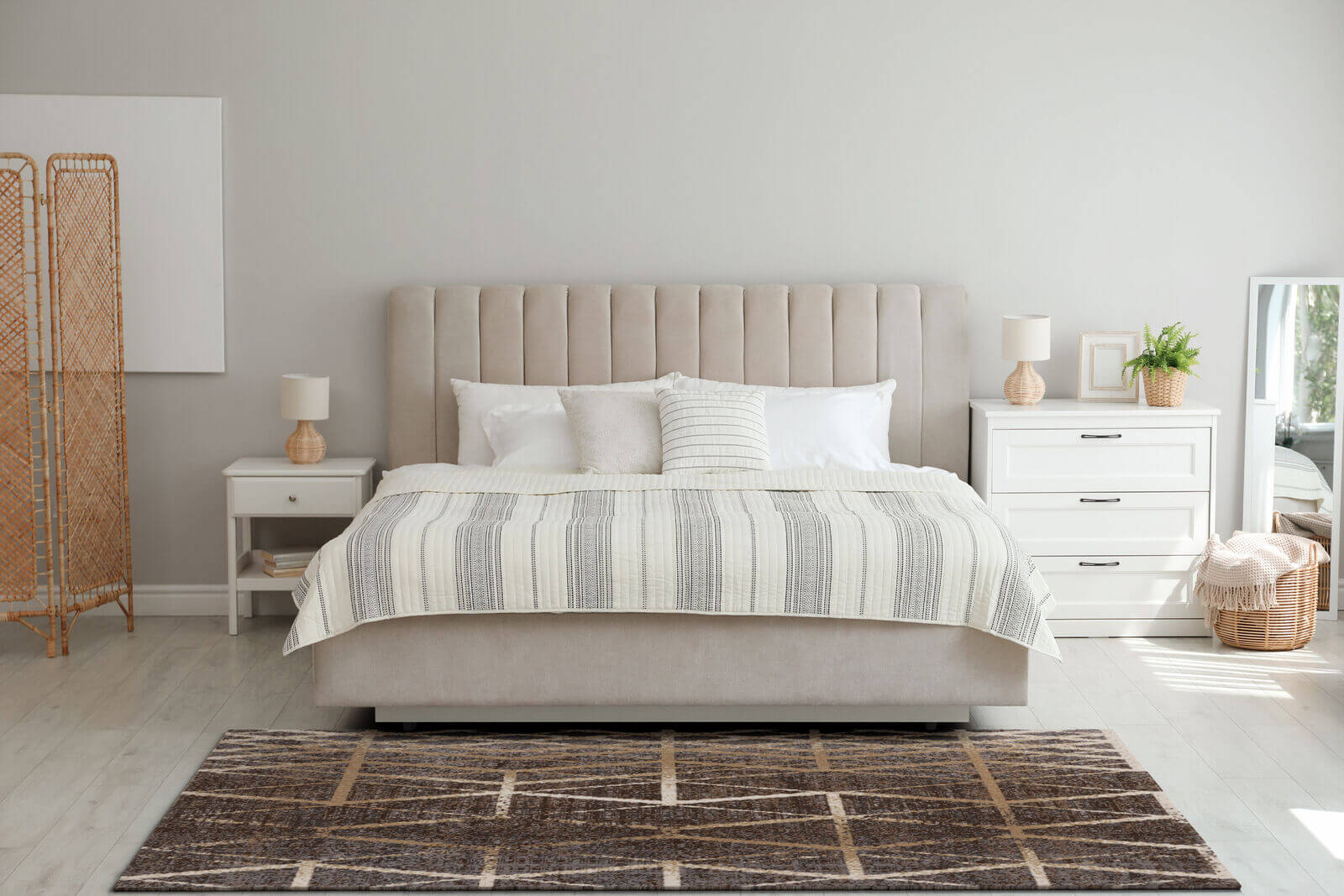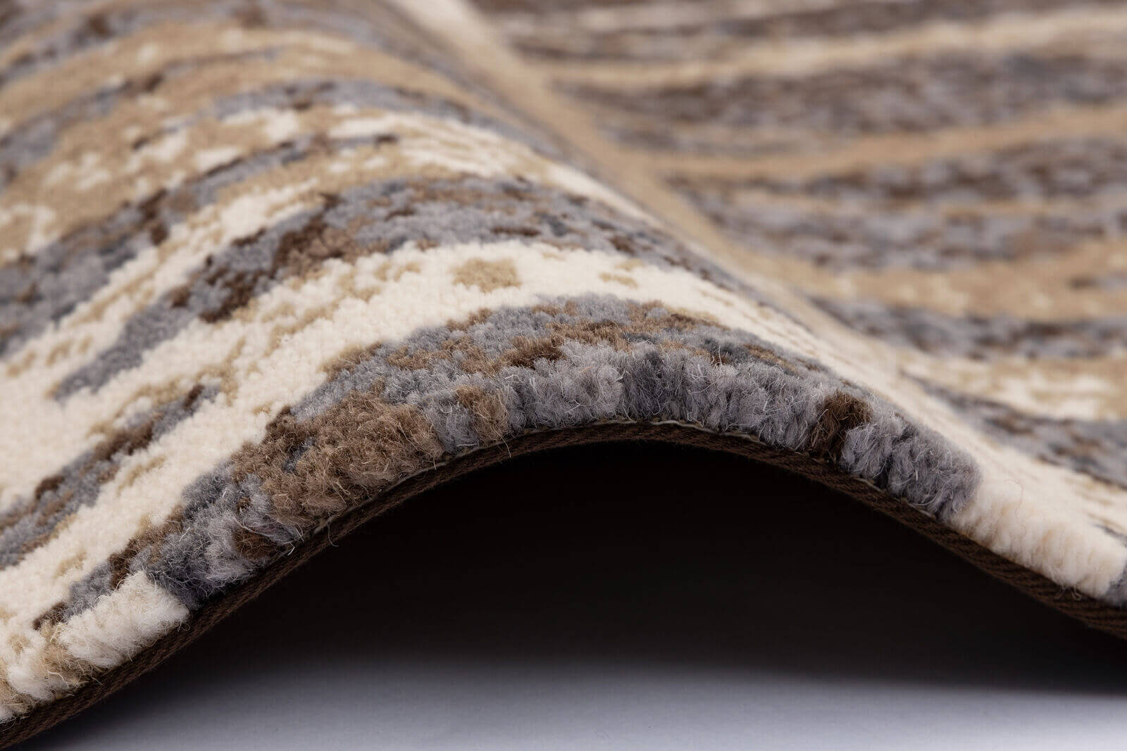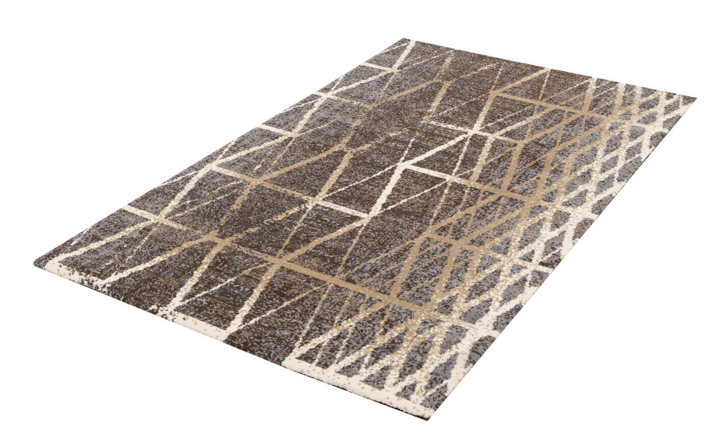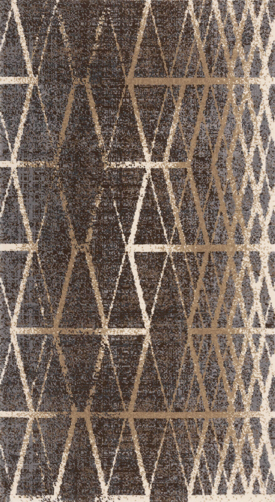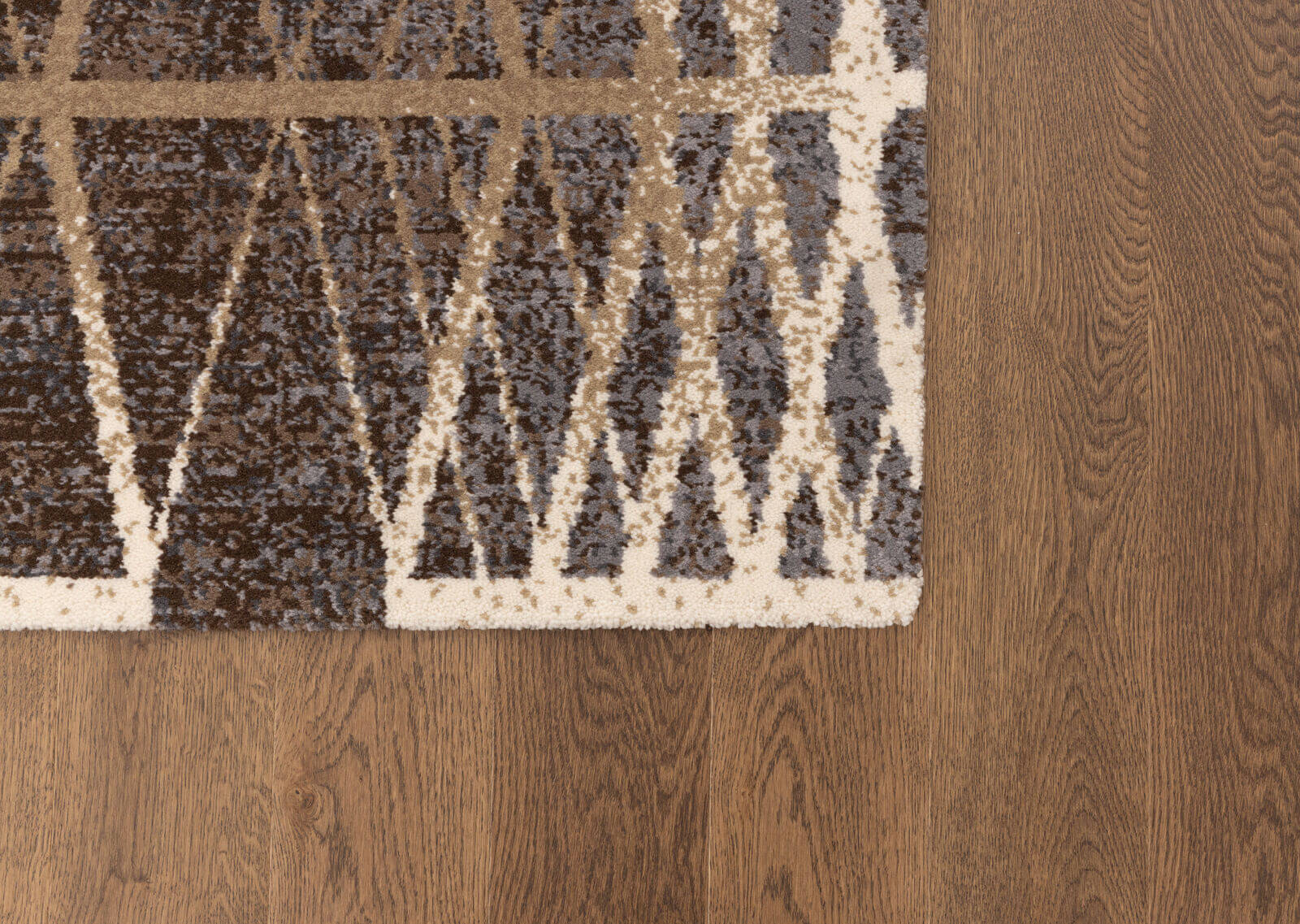 Nowoczesny dywan z geometrycznym wzorem w odcieniach beżu zestawionym z wielobarwnym tłem (szaro-niebieski, brąz, krem). Wzór nadaje wnętrzu dynamizmu, jest idealny dla nowoczesnych przestrzeni. Wykonany z luksusowej wełny owczej, gwarantującej jego trwałość i komfort.
