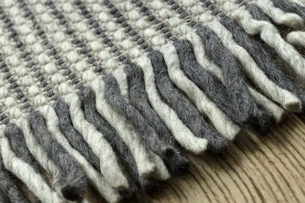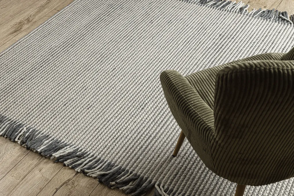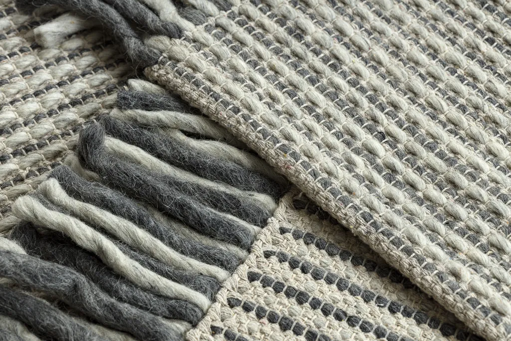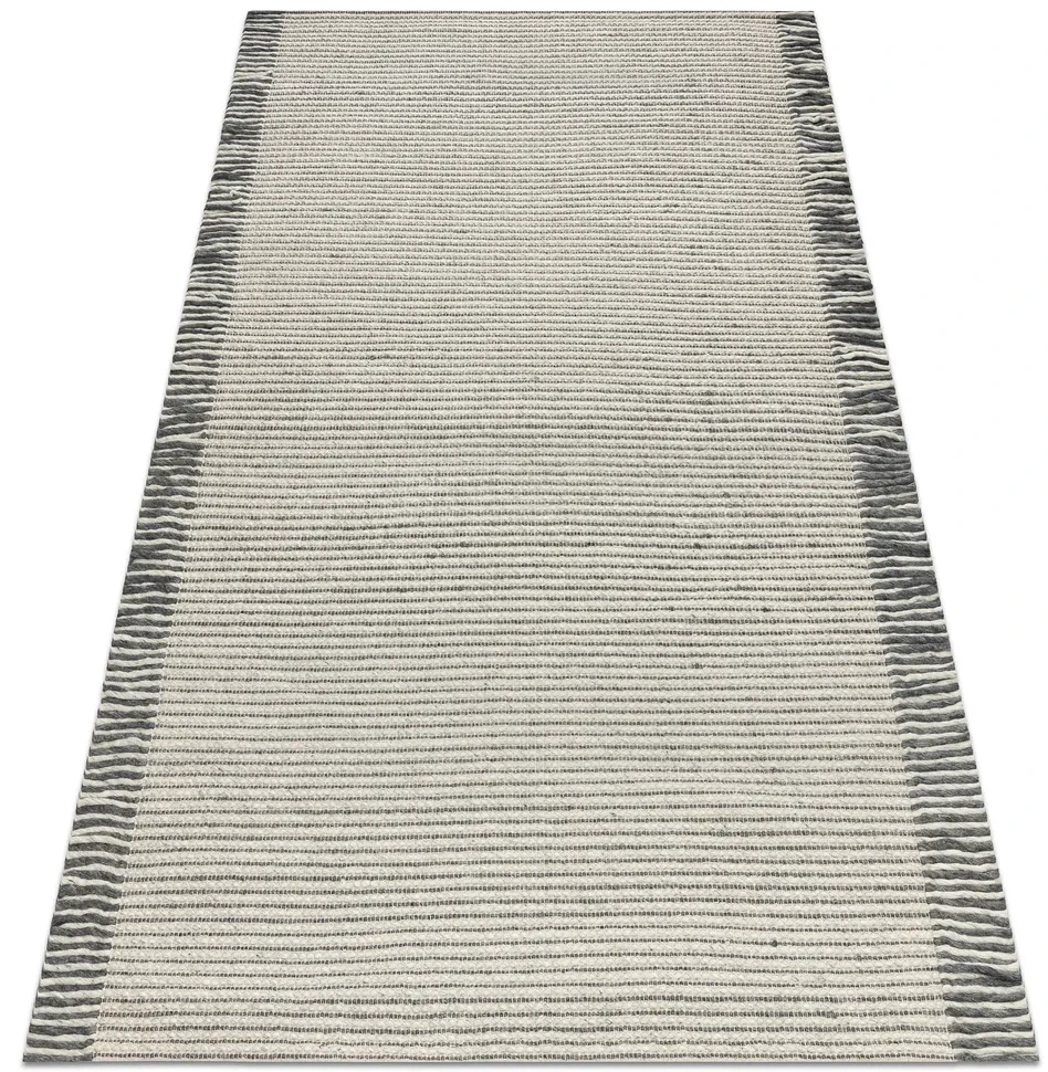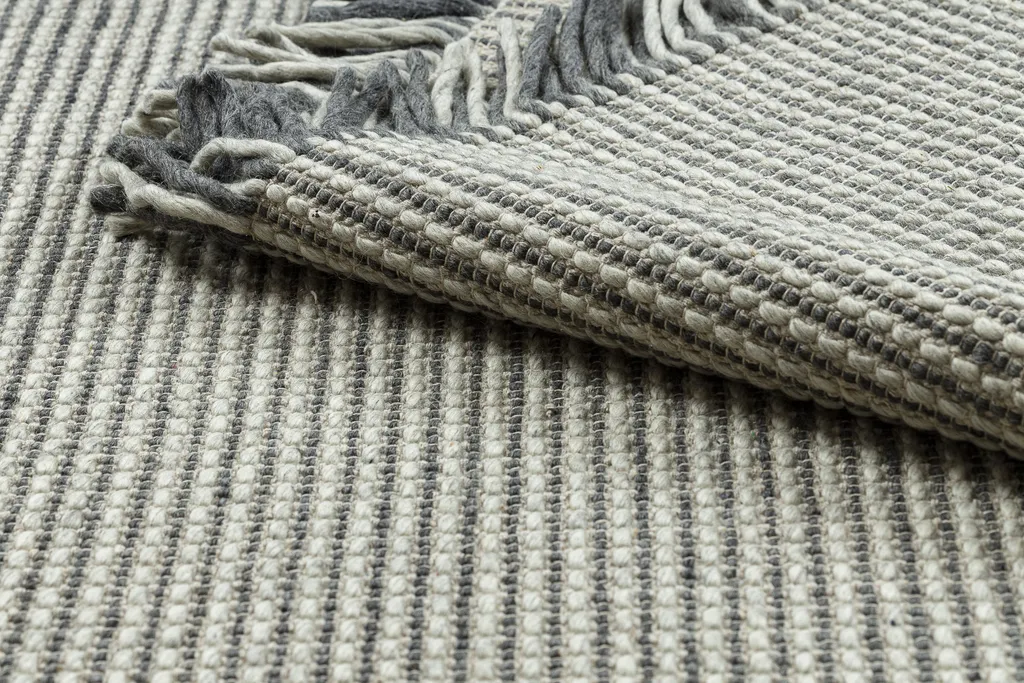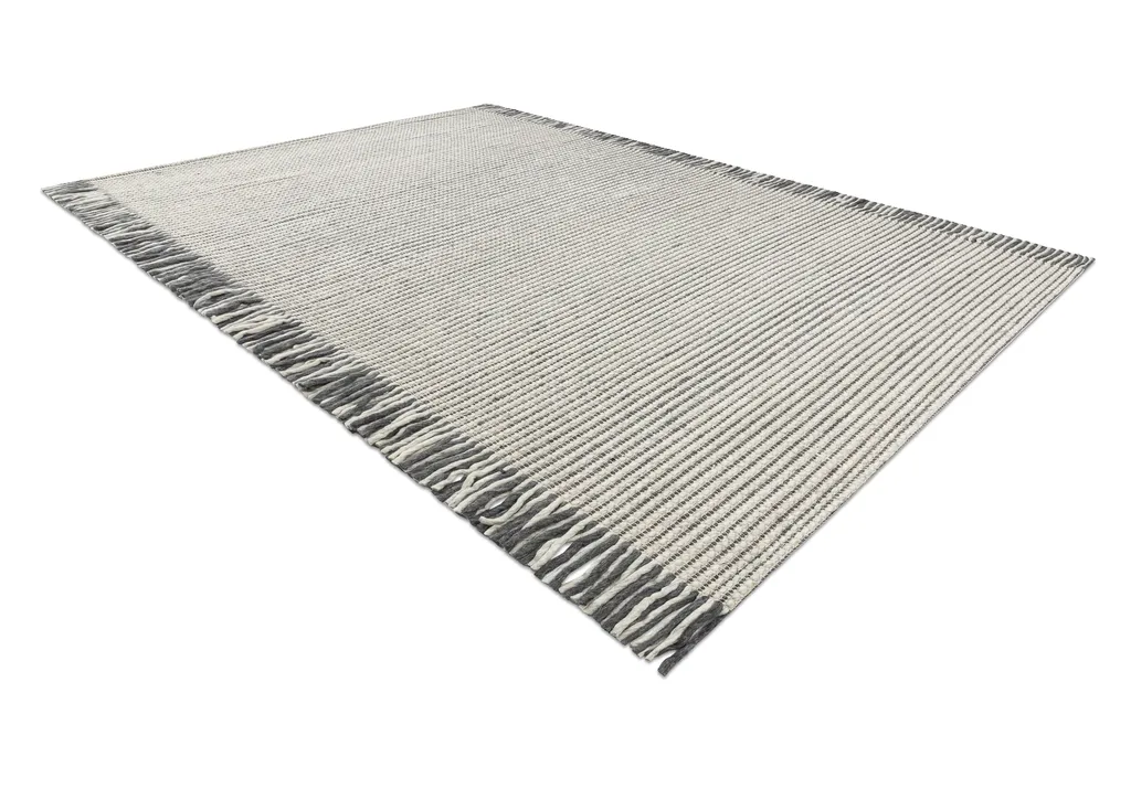 Ręcznie tkany na płasko dywan wełniany z frędzlami u dłuższych boków, o wzorze w prążki. Wykonany z wysokiej jakości naturalnej wełny, jest wyjątkowo trwały i łatwy w utrzymaniu. Idealny do wnętrz ceniących styl i jakość.