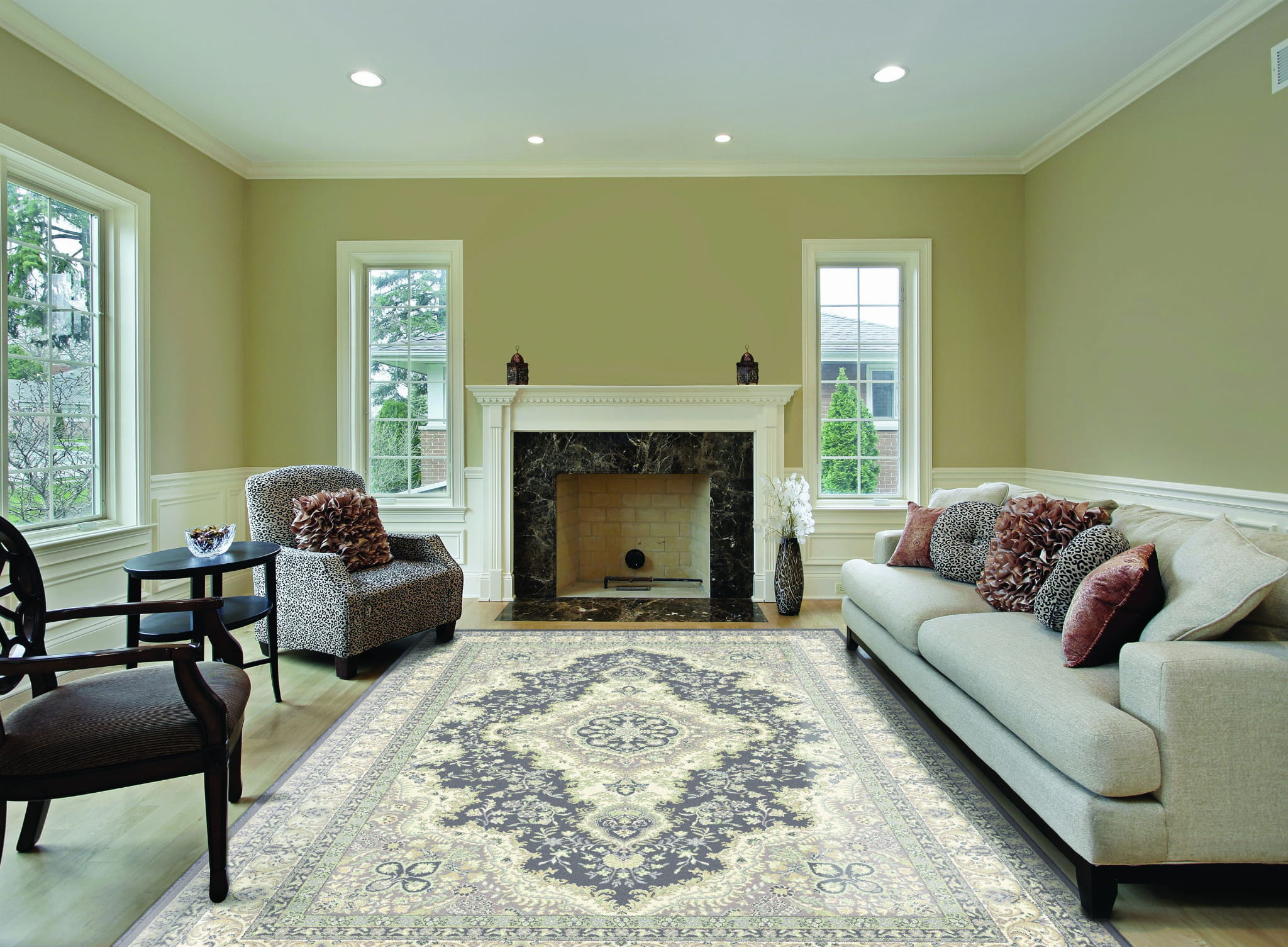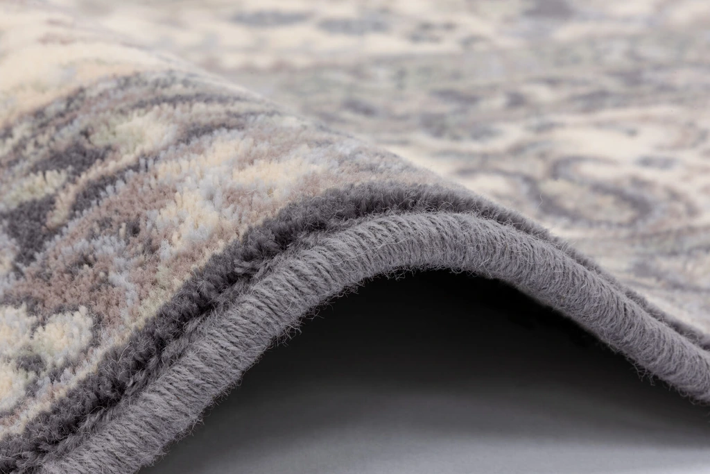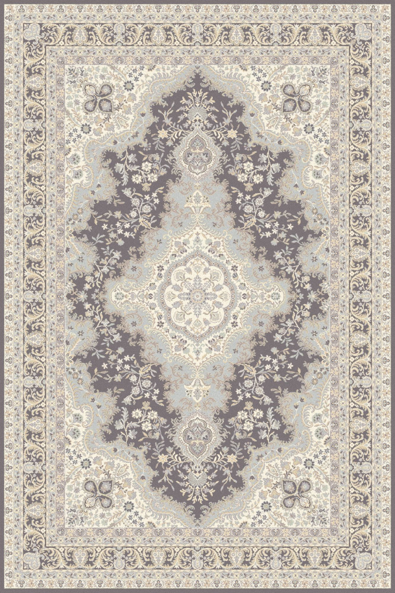 Tradycyjny dywan utrzymany w stylistyce wiekowych kobierców, wykonany z najwyższej jakości wełny owczej. Na antracytowym tle znajdują się misterne kremowo-szare wzory inspirowane motywami orientalnymi. Jest to produkt bezpieczny dla zdrowia, do użytku domowego i w obiektach użyteczności publicznej.