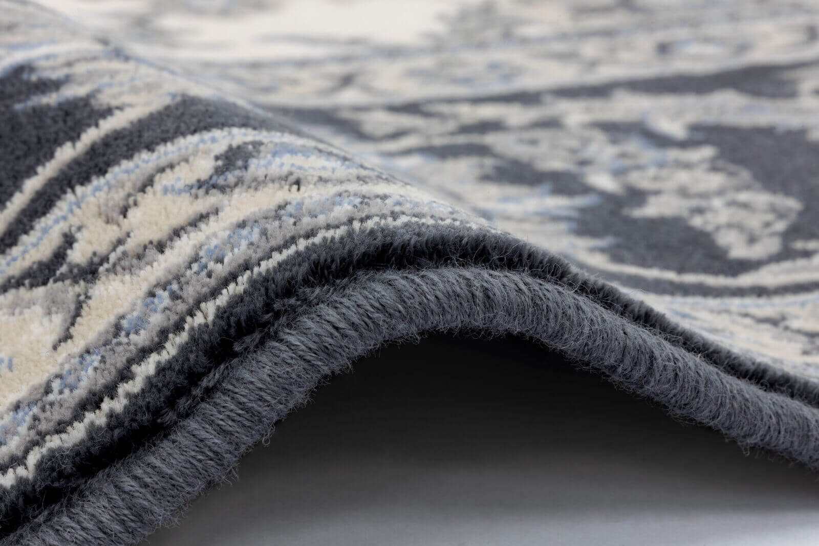 Wełna owcza klasy premium zapewnia luksusowy komfort i trwałość. Dywan w białym kolorze z klasycznym wzorem oraz bogato zdobioną grafitową bordiurą dodaje wnętrzu elegancji i harmonii. Jest to produkt bezpieczny dla zdrowia, do użytku domowego i w obiektach użyteczności publicznej.