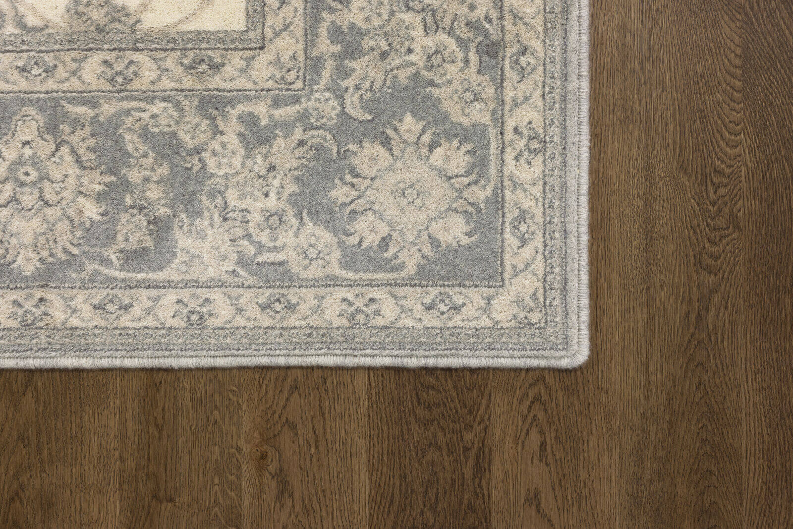 Wełna owcza klasy premium zapewnia luksusowy komfort i trwałość. Dywan w kolorze szaro-beżowym z klasycznym wzorem oraz bogato zdobioną bordiurą dodaje wnętrzu elegancji i harmonii. Jest to produkt bezpieczny dla zdrowia, do użytku domowego i w obiektach użyteczności publicznej.