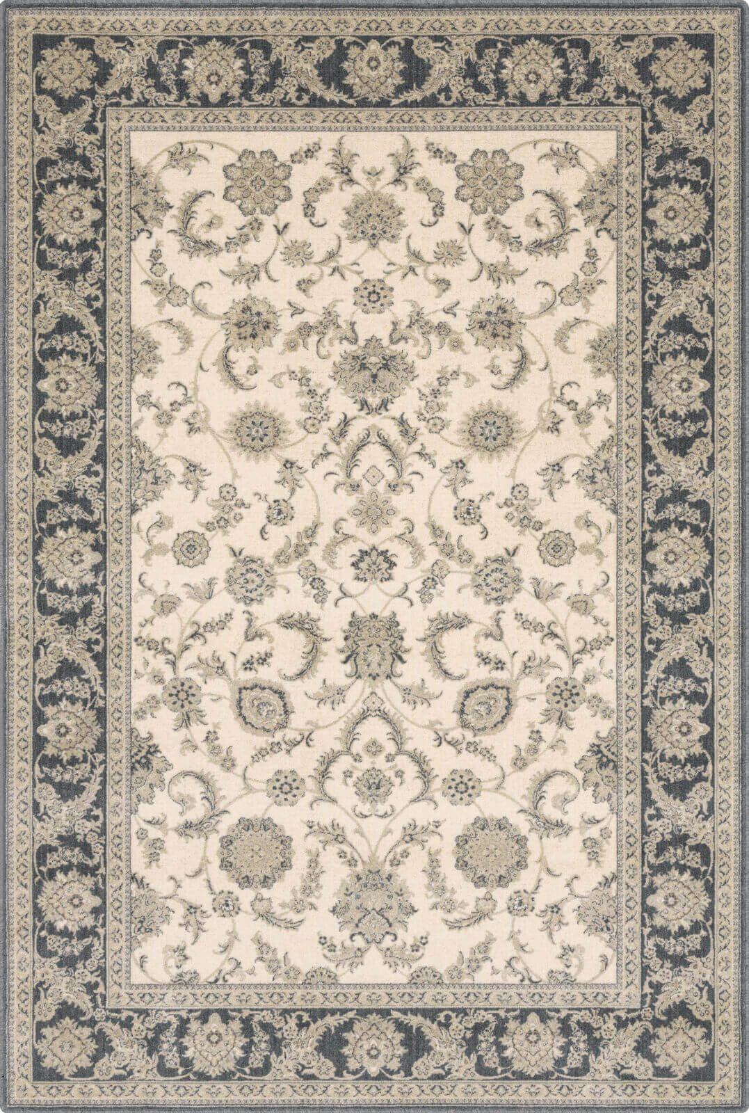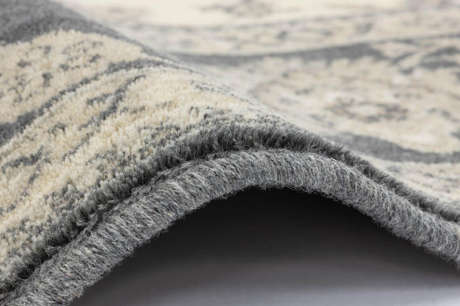 Wełna owcza klasy premium zapewnia luksusowy komfort i trwałość. Dywan w kolorze złamanej bieli z klasycznym wzorem oraz bogato zdobioną antracytowo-popielatą bordiurą dodaje wnętrzu elegancji i harmonii. Jest to produkt bezpieczny dla zdrowia, do użytku domowego i w obiektach użyteczności publicznej.