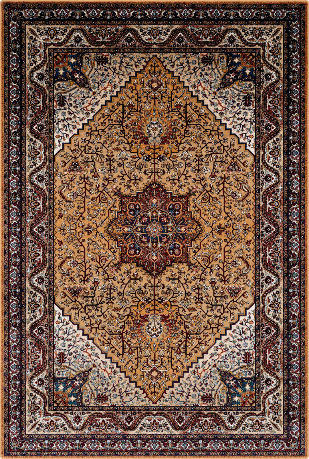 Dywan w bogatej palecie kolorów z dominacją czerwieni i pomarańczowego. Wykonany z najwyższej jakości wełny owczej, gwarantującej trwałość i miękkość. Wzór inspirowany orientalnymi motywami, nadaje wnętrzu elegancji i wyjątkowego charakteru. Jest to produkt bezpieczny dla zdrowia, do użytku domowego i w obiektach użyteczności publicznej.
