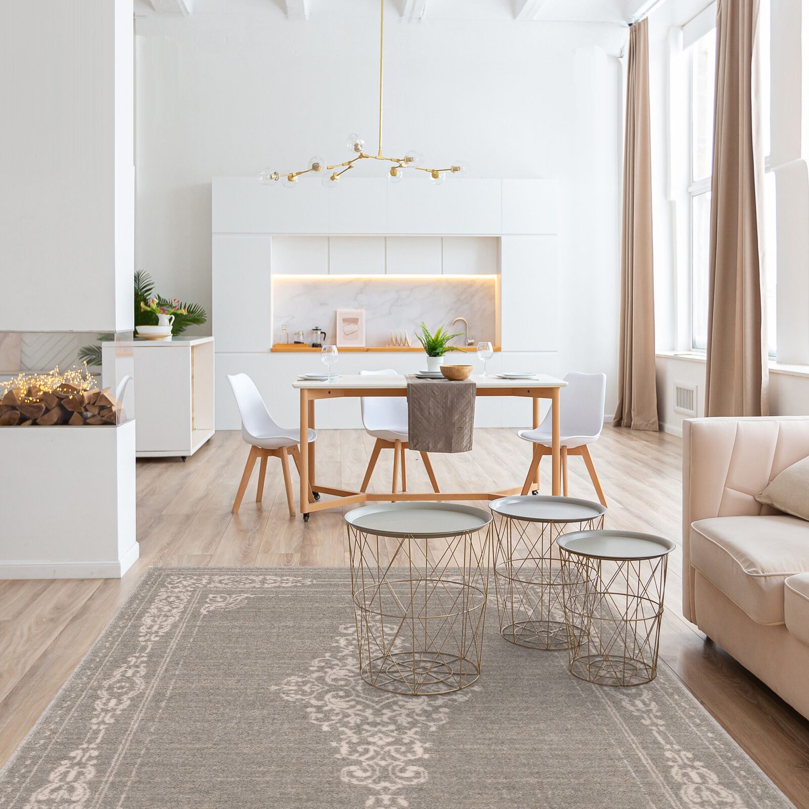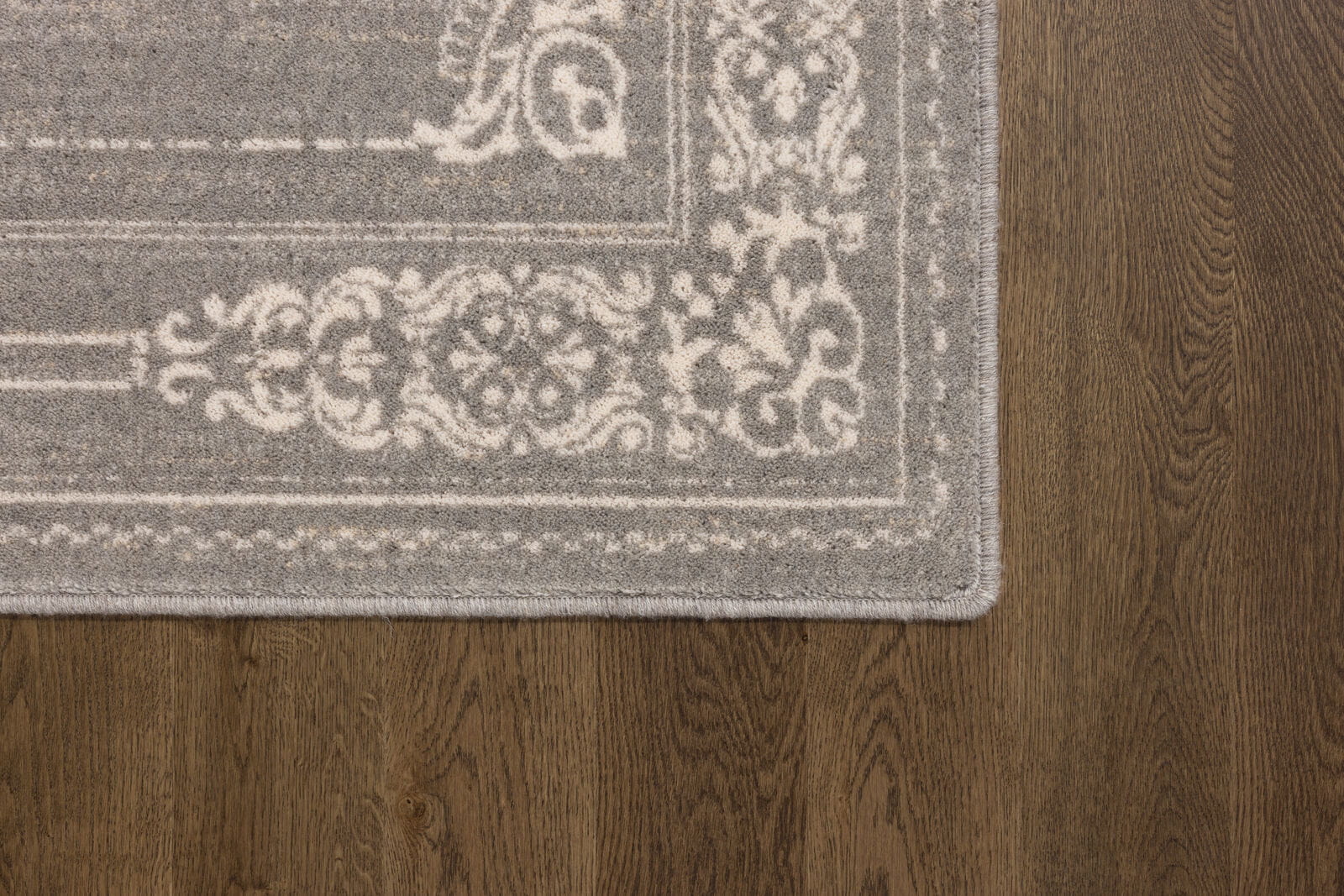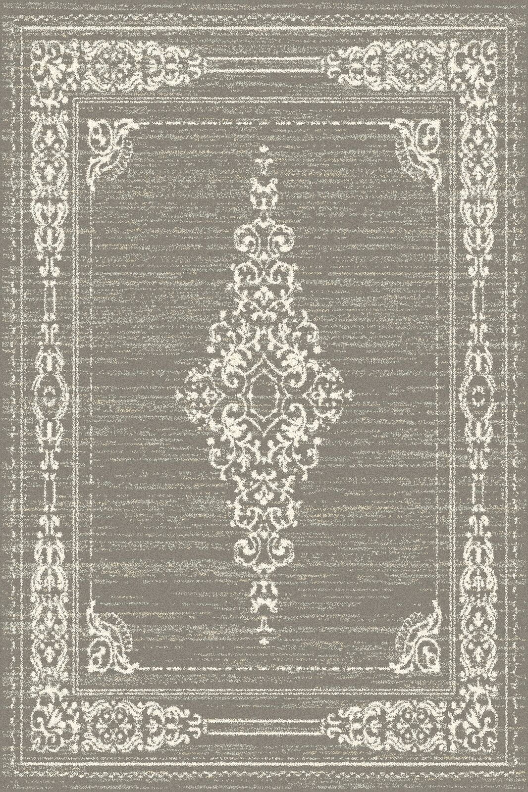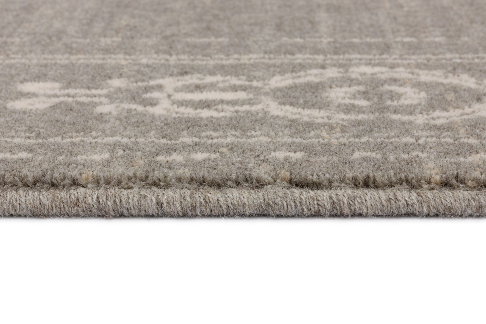 W odcieniach szarości, klasyczny dywan z bogato zdobioną ramą. Został wytkany z mieszanki wełny brytyjskiej i nowozelandzkiej z efektem melanżu.