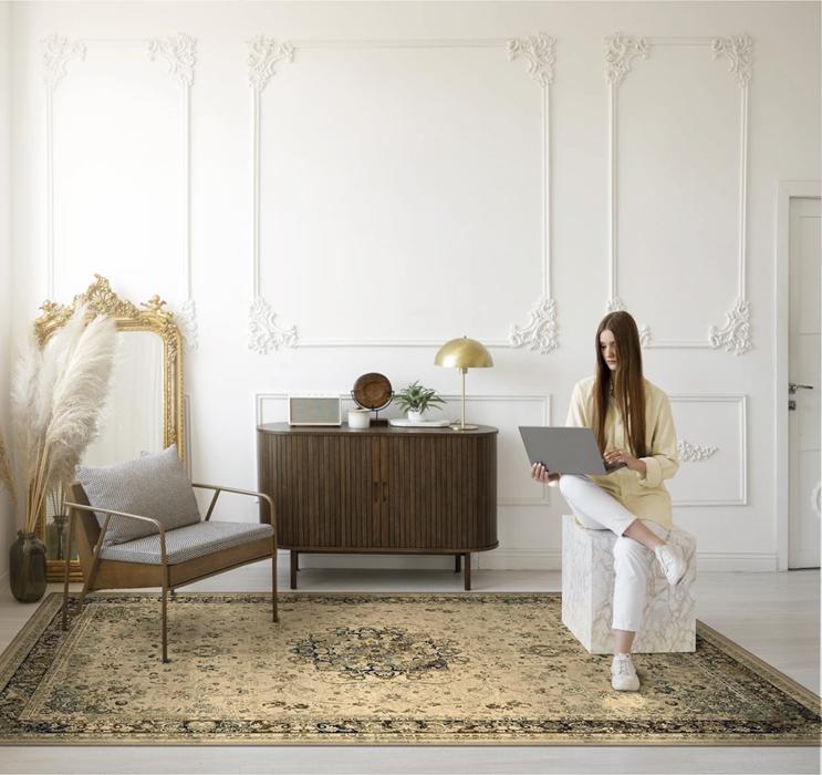 Elegancki dywan charakteryzujący się delikatnymi, roślinnymi wzorami i krągłymi kształtami, które nadają wnętrzu harmonijnego wyglądu. Wykonany z wysokogatunkowej wełny owczej, łączy estetykę z trwałością oraz łatwością w utrzymaniu.