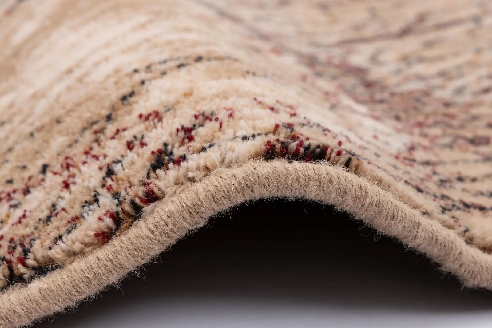 Dywan ten to nowoczesny dodatek do wnętrza. Wykonany z najwyższej jakości wełny owczej, w odcieniach beżu, zachwyca nieoczywistym, abstrakcyjnym wzorem przywołującym na myśl morskie klimaty. Przeznaczony zarówno do domów, jak i do przestrzeni publicznych.