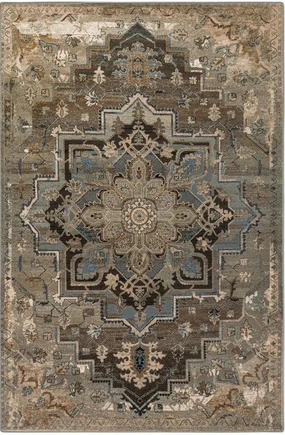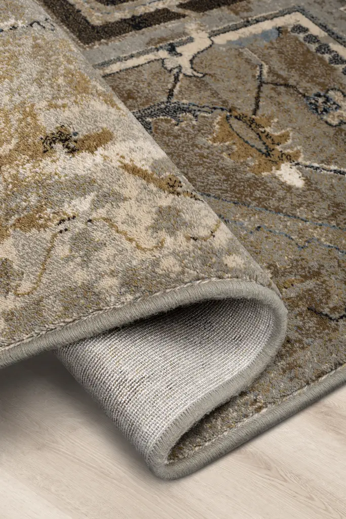 Dywan w orientalnym stylu z centralnym medalionem, otoczonym geometrycznymi i roślinnymi wzorami. Utrzymany w odcieniach koniaku, złota, beżu i granatu, z efektem postarzania dla eleganckiego, vintage charakteru. Wykonany z najwyższej jakości wełny nowozelandzkiej, łączy precyzję wykonania z wyjątkową trwałością.