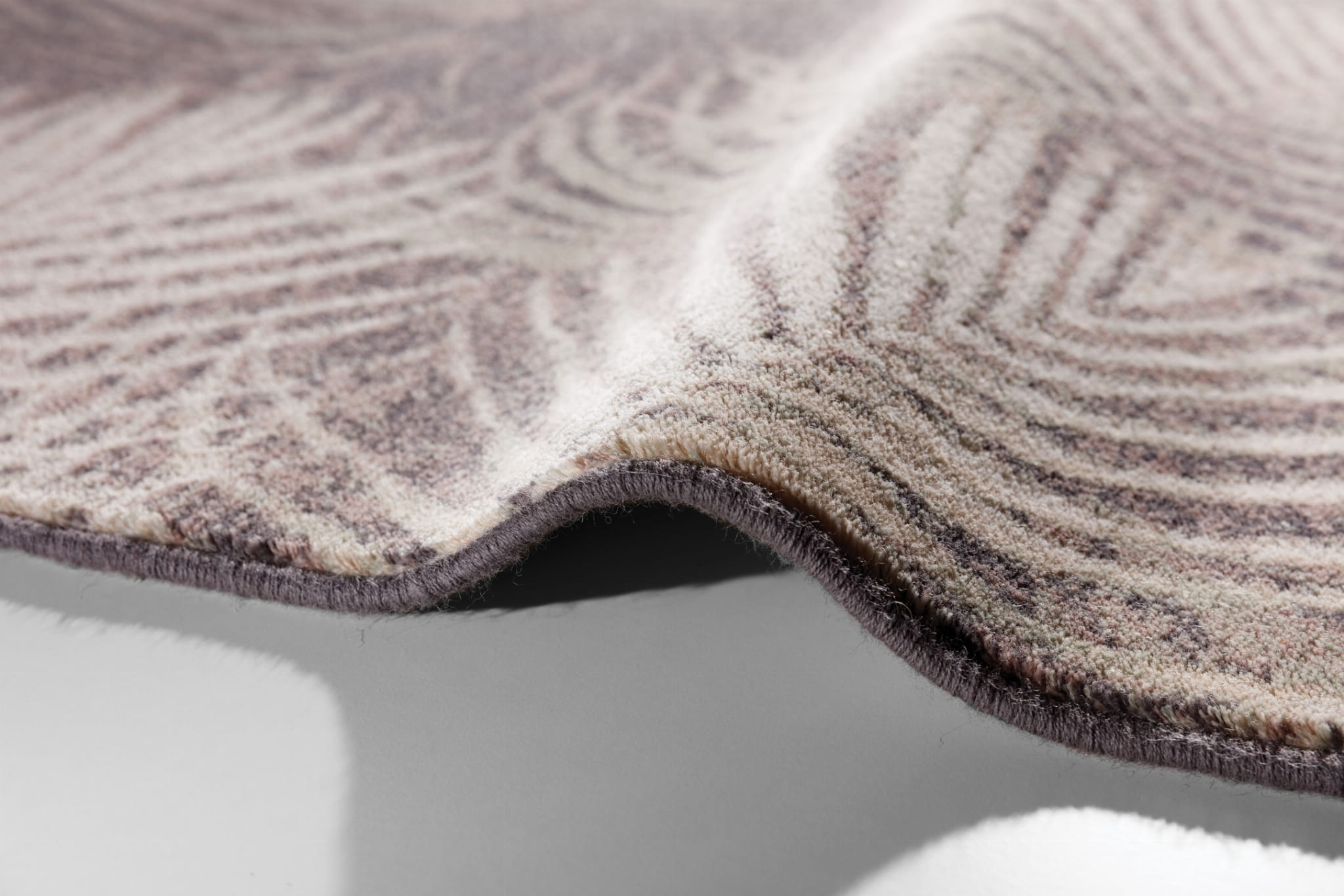 Nowoczesny dywan w antracytowym kolorze z motywem roślinnymi liści palm. Wyprodukowany z wysokiej jakości wełny, zapewnia miękkość i trwałość. Doskonale podkreśli atmosferę wnętrza, wzbogacając go o element przyrody. Jest to produkt bezpieczny dla zdrowia, do użytku domowego i w obiektach użyteczności publicznej.