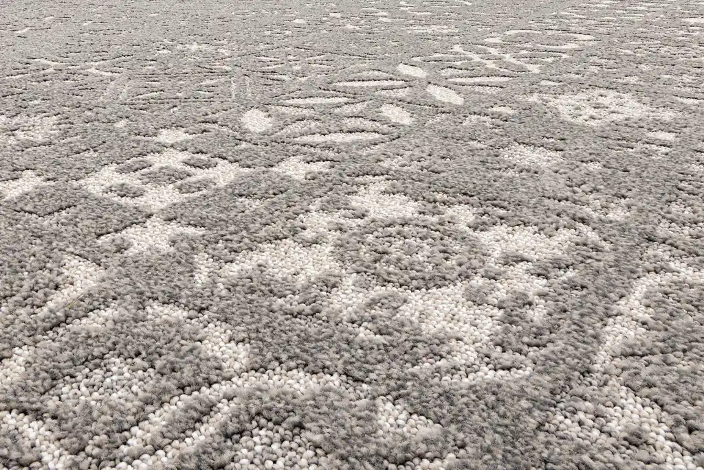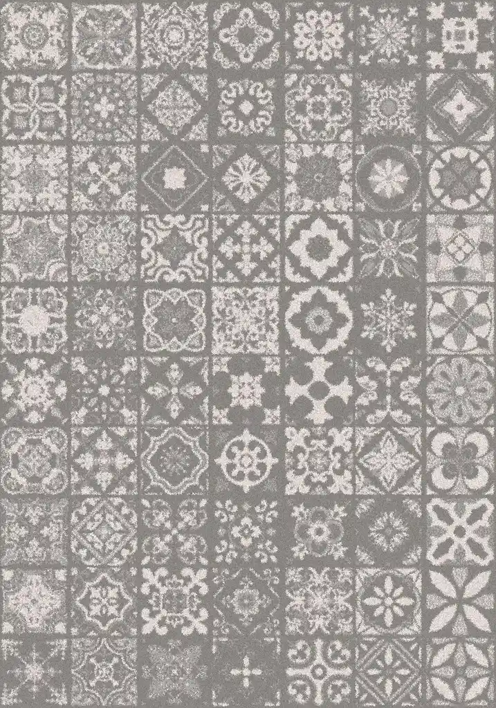 Dywan ma wzór mozaiki z dekoracyjnych kafelków w odcieniach szarości i bieli, z różnorodnymi geometrycznymi i roślinnymi motywami. Wykonany z wysokiej jakości przędzy polipropylenowej Heat Set Frise co gwarantuje trwałość i łatwość pielęgnacji.