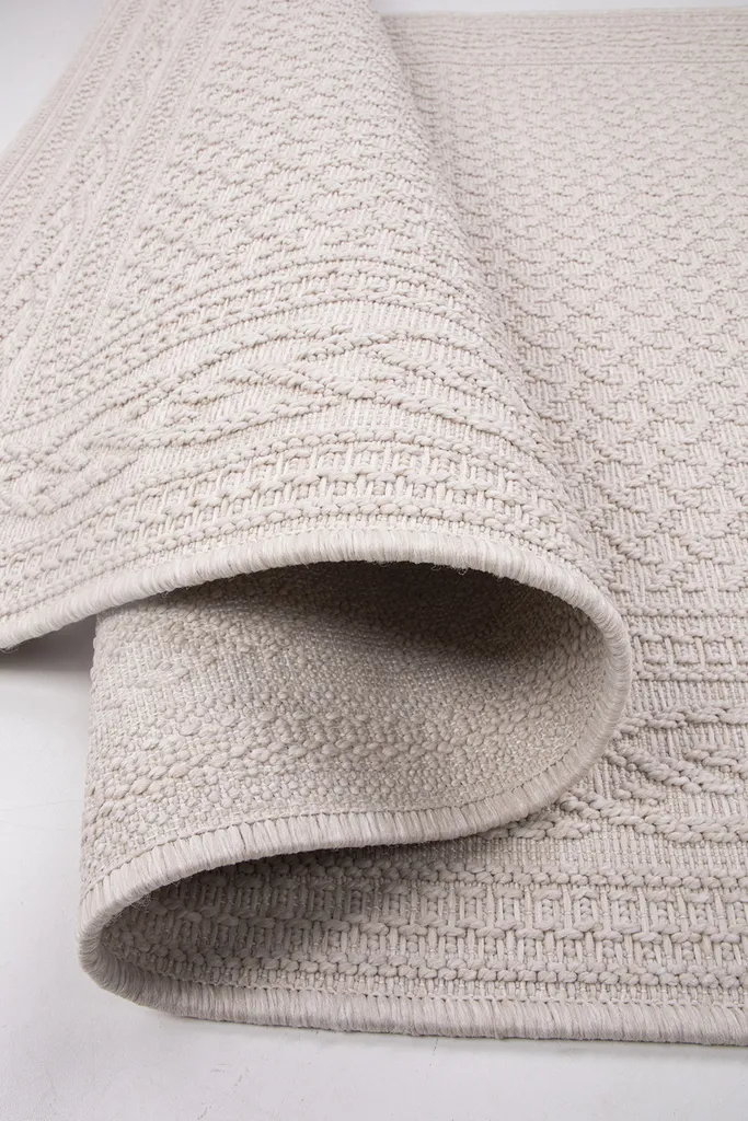 Nowoczesny, dywan sznurkowy o płaskim splocie z geometrycznym wzorem 3d, otoczonym ozdobną ramką. Wykonany z wytrzymałego materiału odpornego na warunki atmosferyczne – praktyczny i łatwy w czyszczeniu, doskonały do wnętrz, na balkon, taras lub do ogrodu.