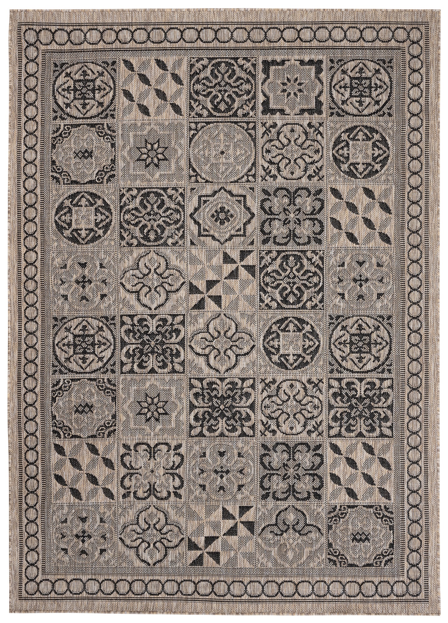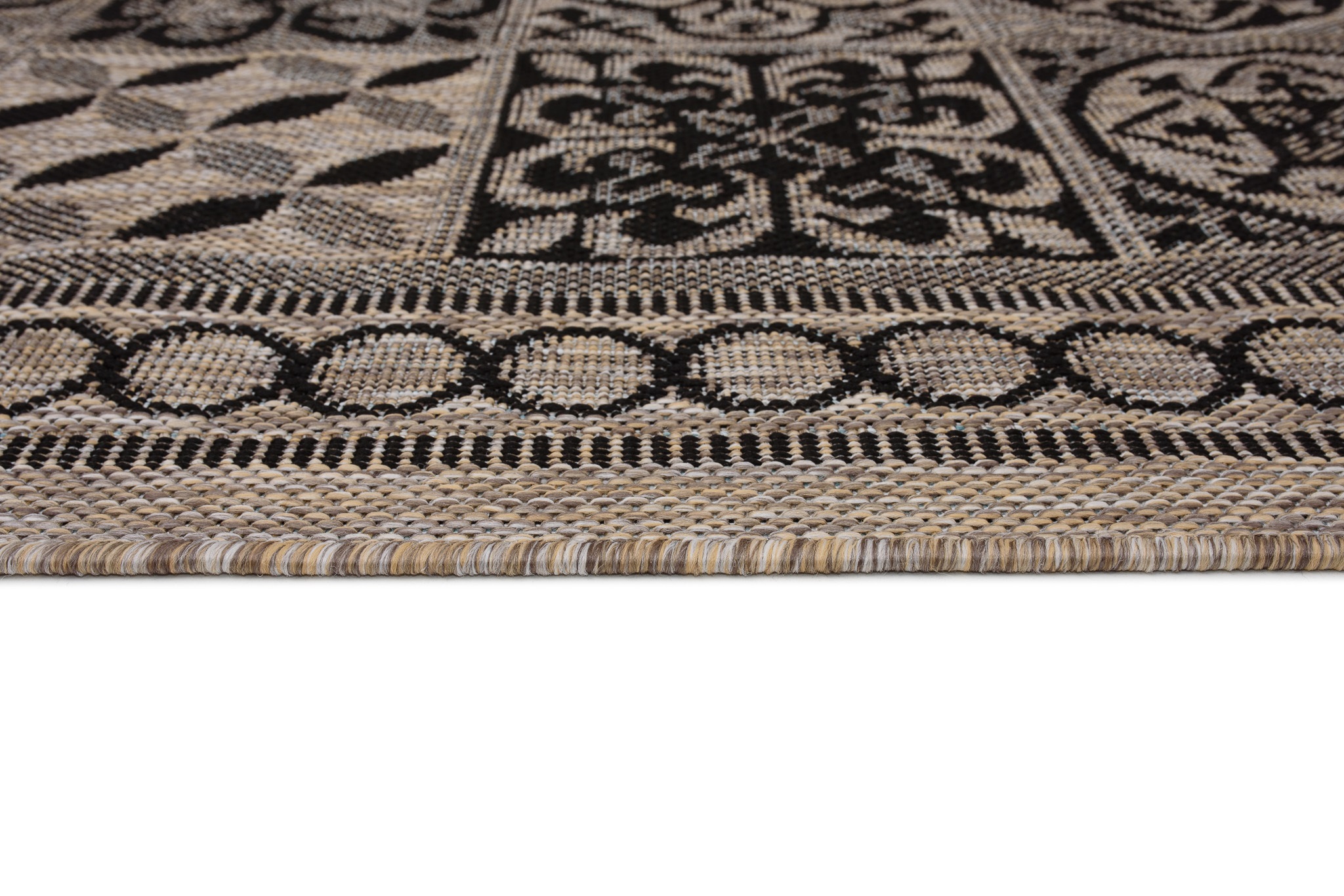 Dywan sznurkowy o płaskim splocie do wnętrz i na zewnątrz. Geometryczny wzór patchworkowy z motywami etnicznymi nadaje mu oryginalny charakter. Trwały materiał odporny na warunki atmosferyczne. Łatwy w czyszczeniu i praktyczny – idealny do domu, ogrodu, na taras lub balkon.