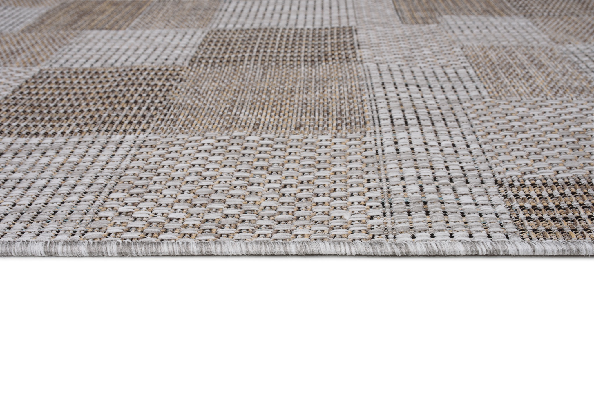 Nowoczesny dywan sznurkowy o płaskim splocie do wnętrz i na zewnątrz. Geometryczne wzory nadają mu nowoczesny charakter, a trwały materiał zapewnia odporność na warunki atmosferyczne. Łatwy w czyszczeniu i praktyczny – idealny do domu, ogrodu, na taras czy balkon.