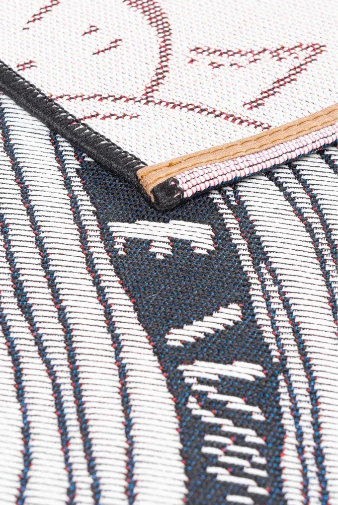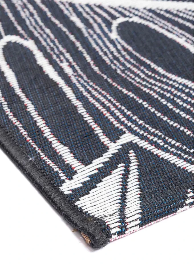 Płaskotkany, biało-czarny dywan wzorem liści monstery i kwiatem na środku, to stylowe i praktyczne rozwiązanie do domu i na zewnątrz. Odporny na warunki atmosferyczne, łatwy w czyszczeniu i idealny na taras, balkon lub do salonu.