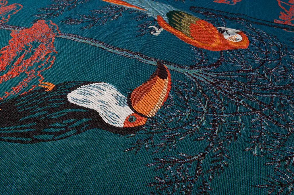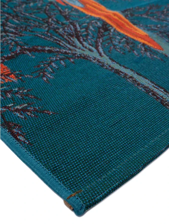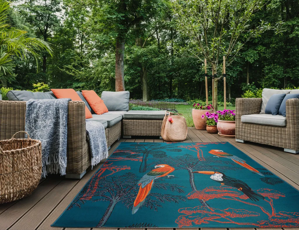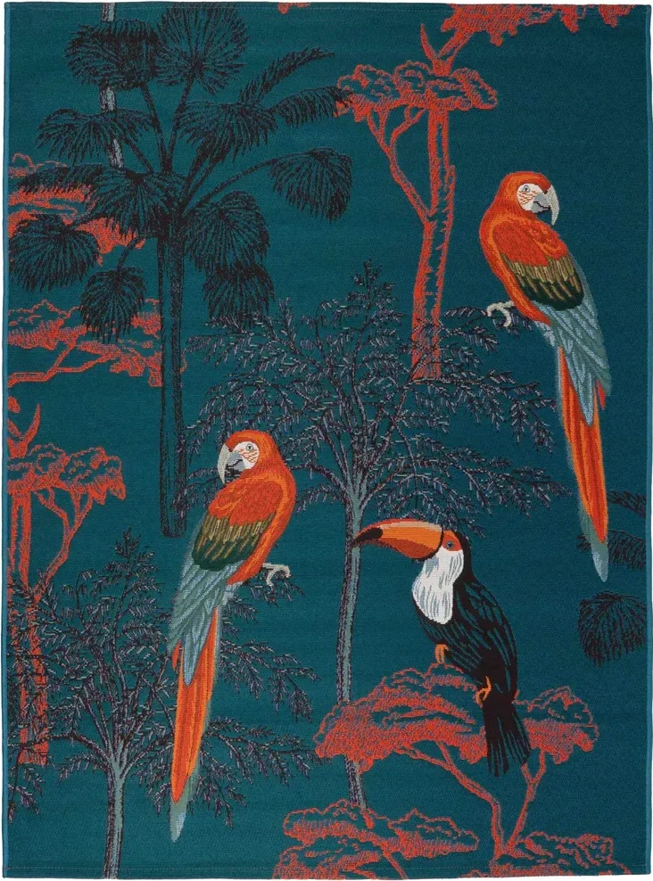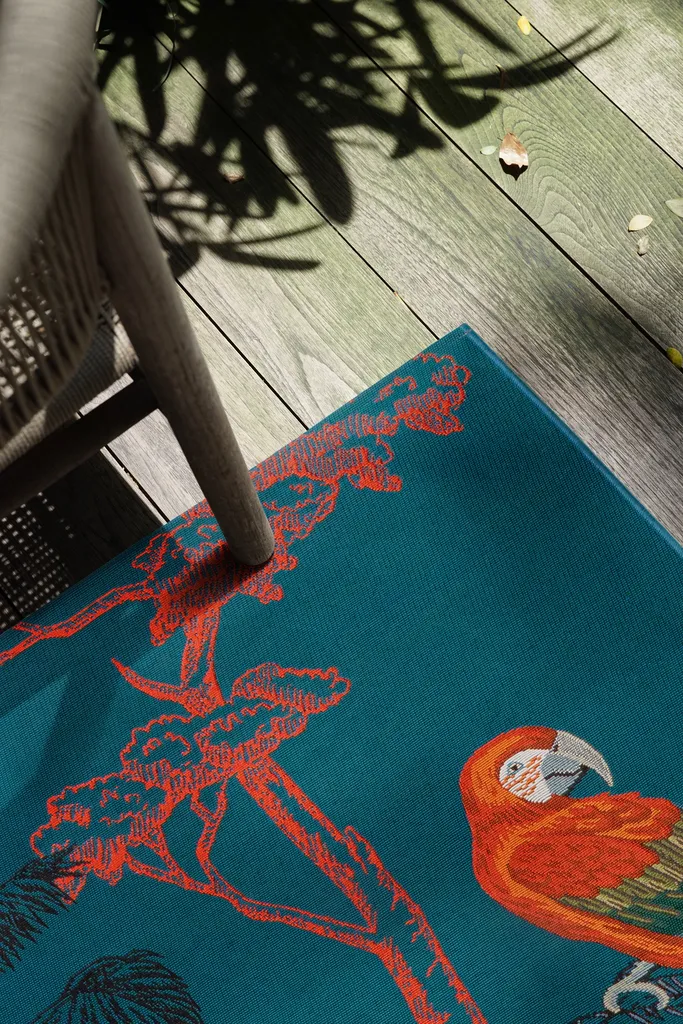 Płaskotkany dywan w kolorowe papugi, to stylowe i praktyczne rozwiązanie do domu i na zewnątrz. Odporny na warunki atmosferyczne, łatwy w czyszczeniu i idealny na taras, balkon lub do salonu.