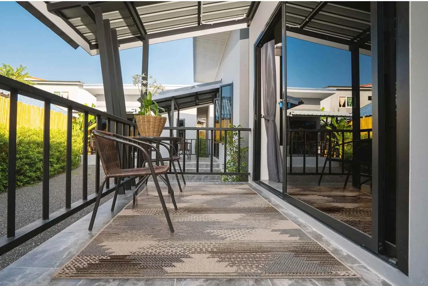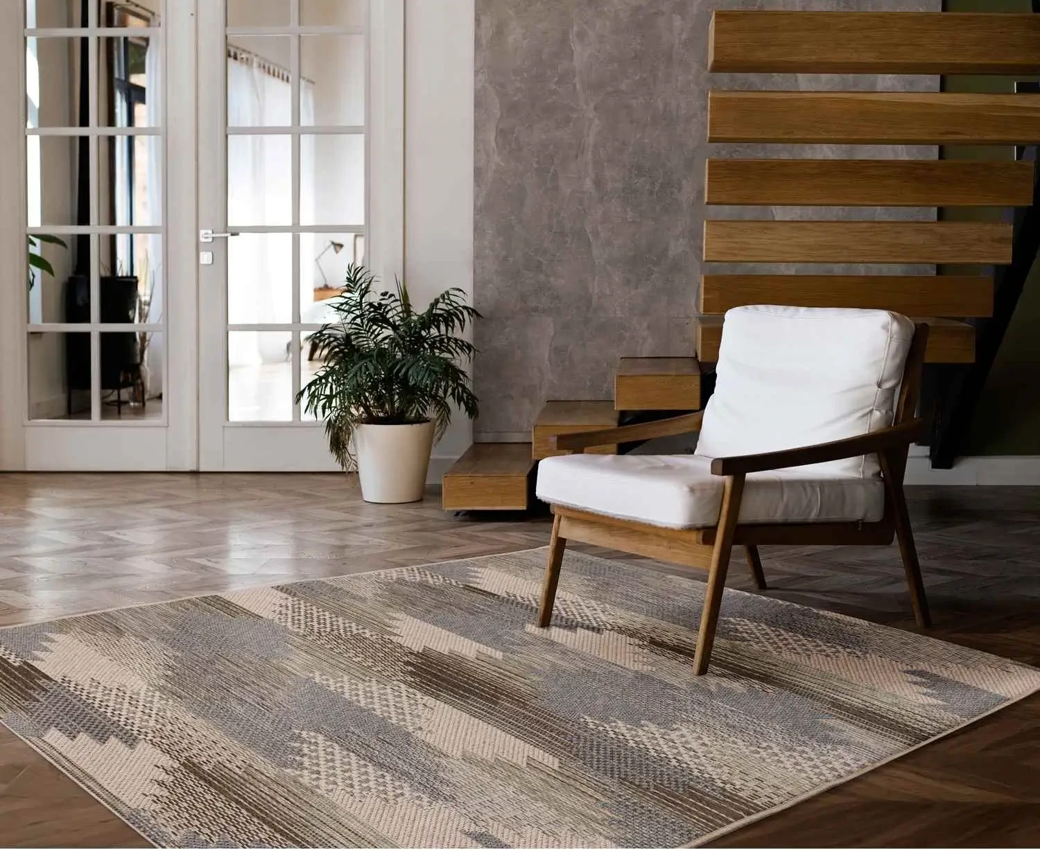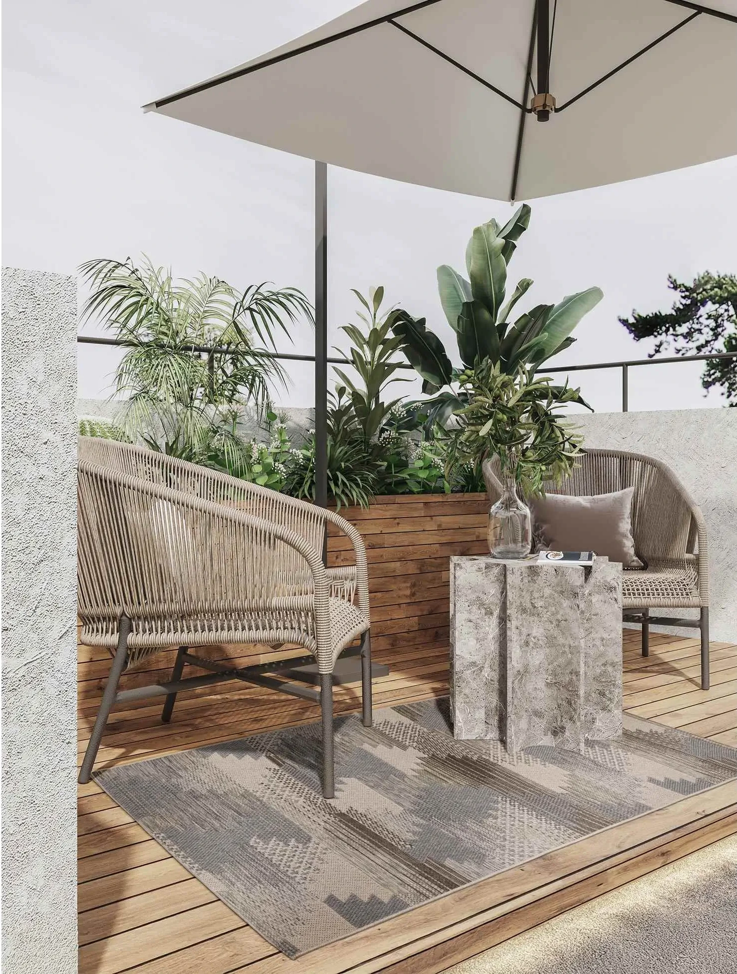 Nowoczesny dywan tkany na płasko z trwałej przędzy heatset, ozdobiony etnicznym wzorem. Odporny na wilgoć, zabrudzenia i promienie UV – idealny do domu oraz na taras czy balkon. Stylowy, praktyczny i łatwy w czyszczeniu.