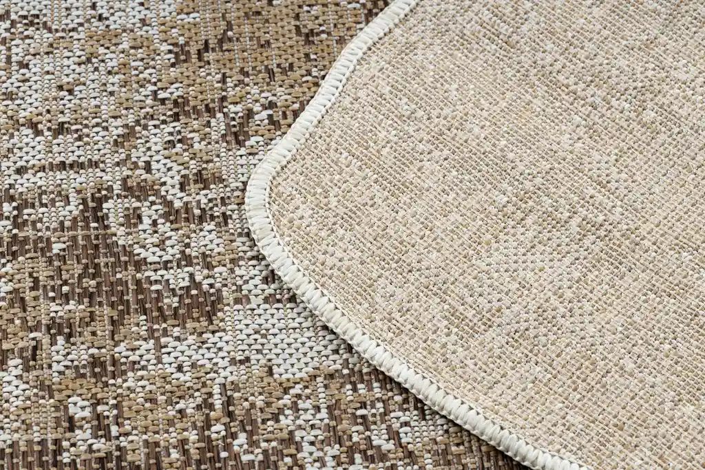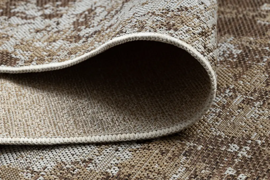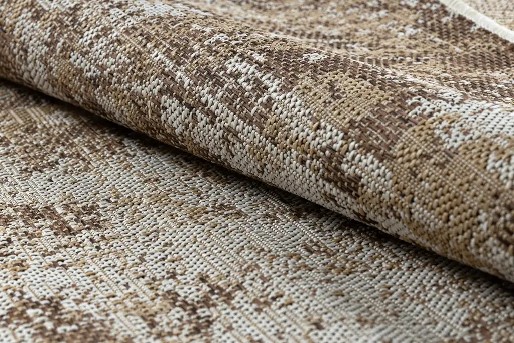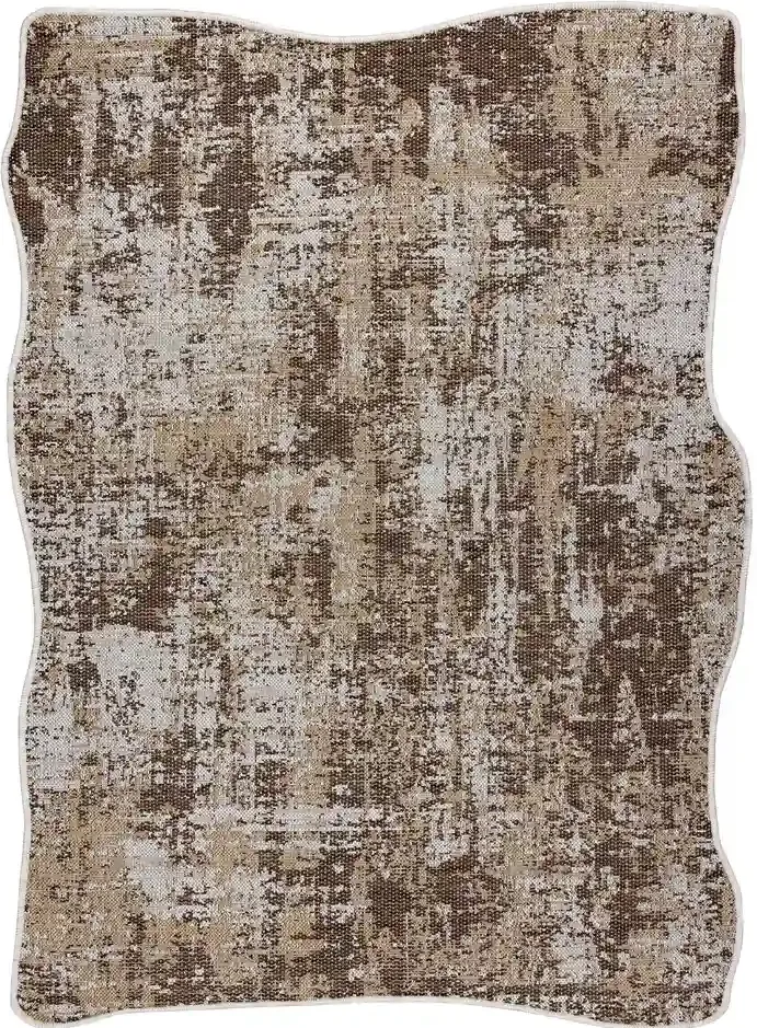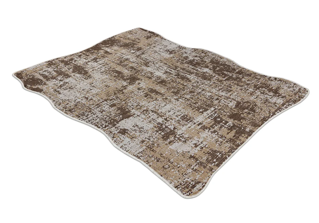 Nowoczesny design, naturalne formy i praktyczna funkcjonalność – to główne atuty tego dywanu. Wzór tworzy abstrakcyjną kompozycję przetarć w brązowo-beżowej tonacji, przypominającą strukturalną powierzchnię. Wykonany z polipropylenu, jest odporny na wilgoć, zabrudzenia oraz promieniowanie UV, dzięki czemu doskonale sprawdzi się nie tylko w warunkach domowych, ale nawet na tarasach, balkonach i w ogrodzie.