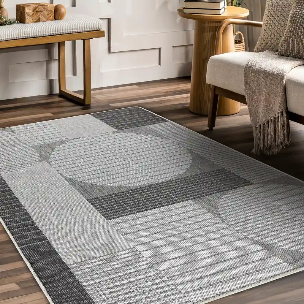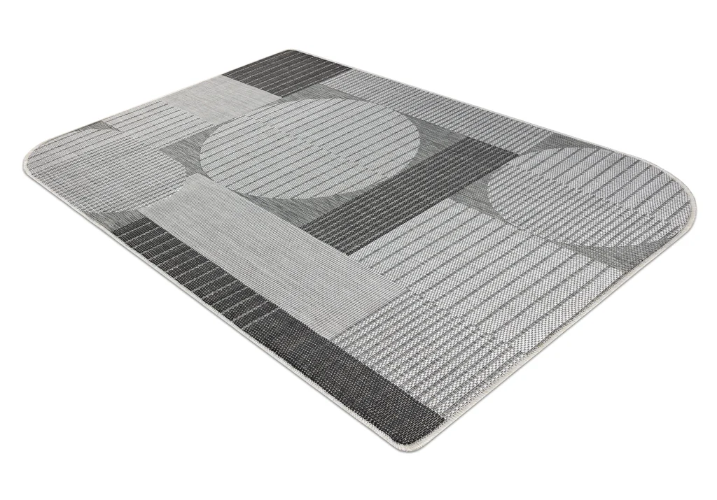 Nowoczesny design, naturalne formy i praktyczna funkcjonalność – to główne atuty tego dywanu. Wzór z dużych kół i prostokątów w odcieniach szarości nadaje mu subtelny, dekoracyjny charakter. Wykonany z polipropylenu, jest odporny na wilgoć, zabrudzenia oraz promieniowanie UV, dzięki czemu świetnie sprawdzi się zarówno w domu, jak i na tarasach, balkonach czy w ogrodzie.