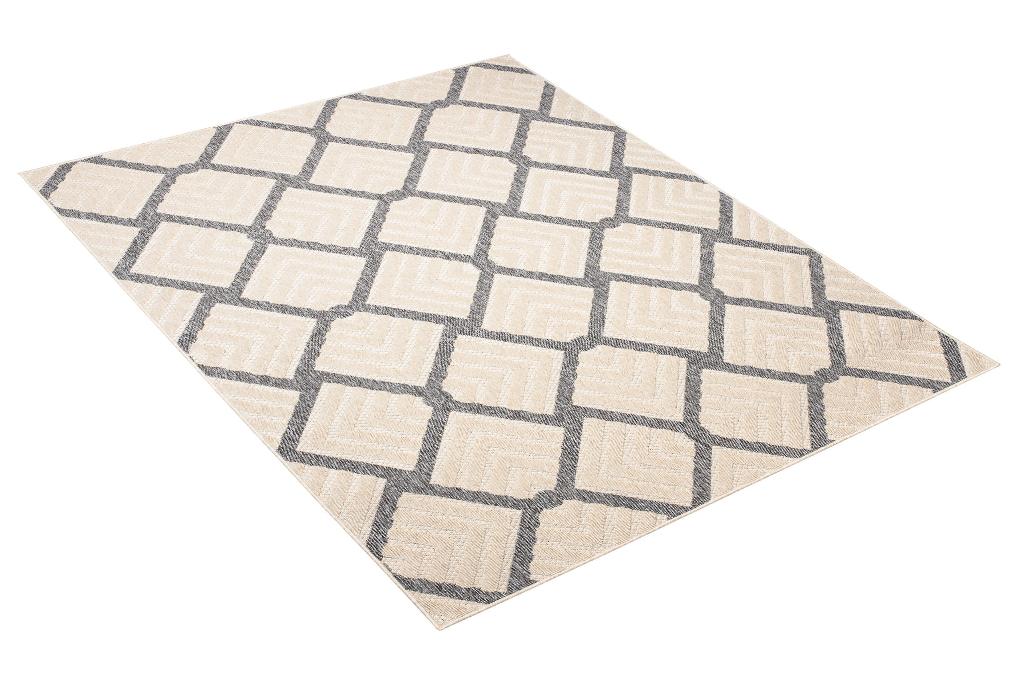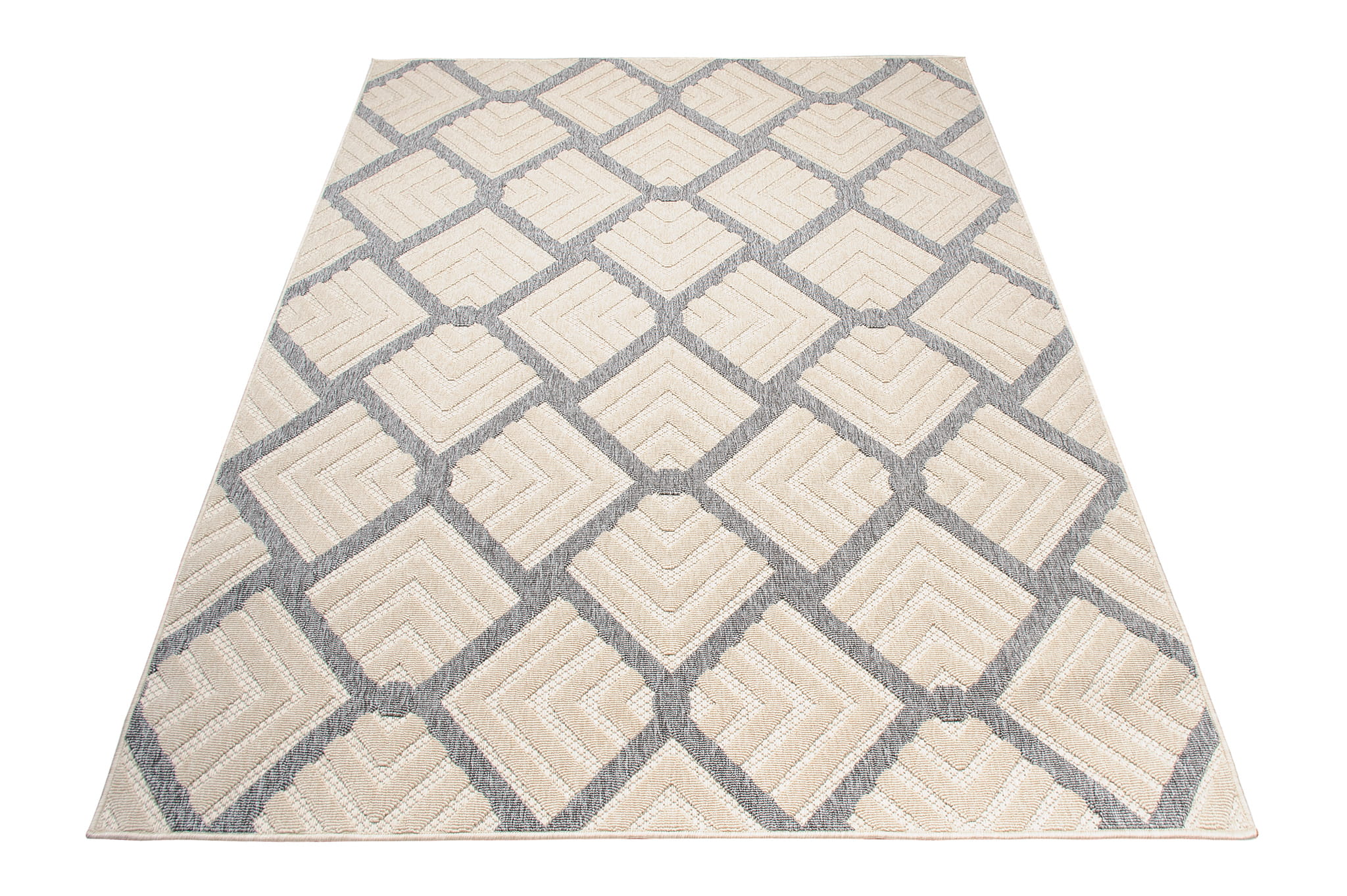 Dywan o nowoczesnym wyglądzie z efektownym, dwupoziomowym runem, które tworzy przestrzenny wzór 3D. Trwała, odporna powierzchnia sprawia, że świetnie sprawdza się zarówno w domu jak i na zadaszonych balkonach i tarasach. Łatwy w pielęgnacji i idealny do stylowych aranżacji na świeżym powietrzu.