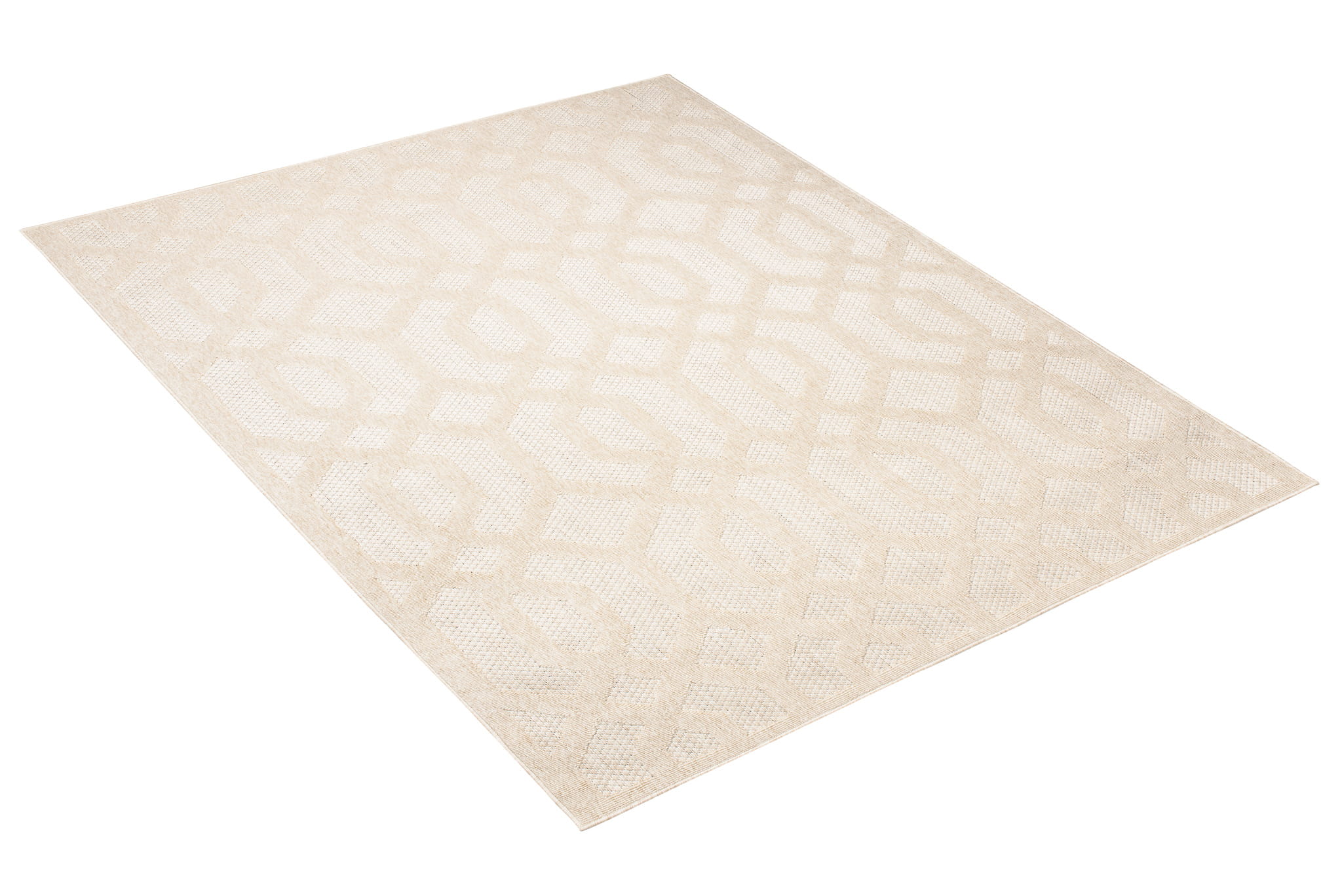 Dywan o nowoczesnym wyglądzie z efektownym, dwupoziomowym runem, które tworzy przestrzenny wzór 3D. Trwała, odporna powierzchnia sprawia, że świetnie sprawdza się zarówno w domu jak i na zadaszonych balkonach i tarasach. Łatwy w pielęgnacji i idealny do stylowych aranżacji na świeżym powietrzu.
