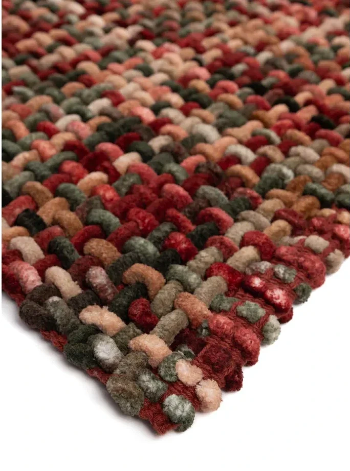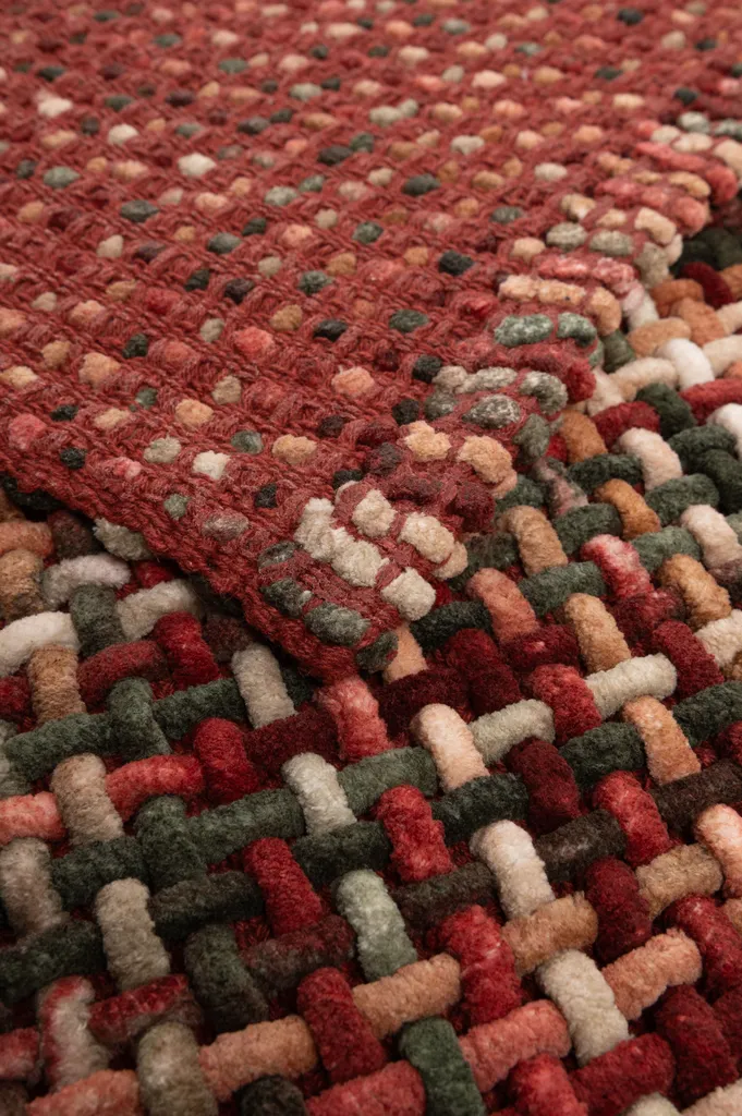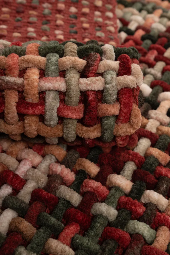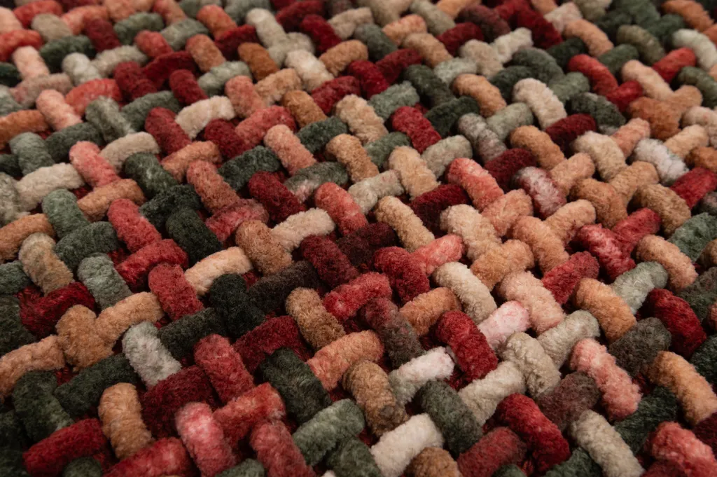 Dywanik łazienkowy w odcieniach bordowych, koralowych i beżu, wykonany z wysokiej jakości włókna syntetycznego. Nowoczesny wzór plecionki. Produkt bezpieczny dla zdrowia i środowiska.