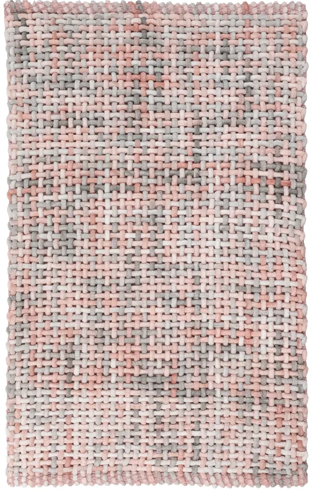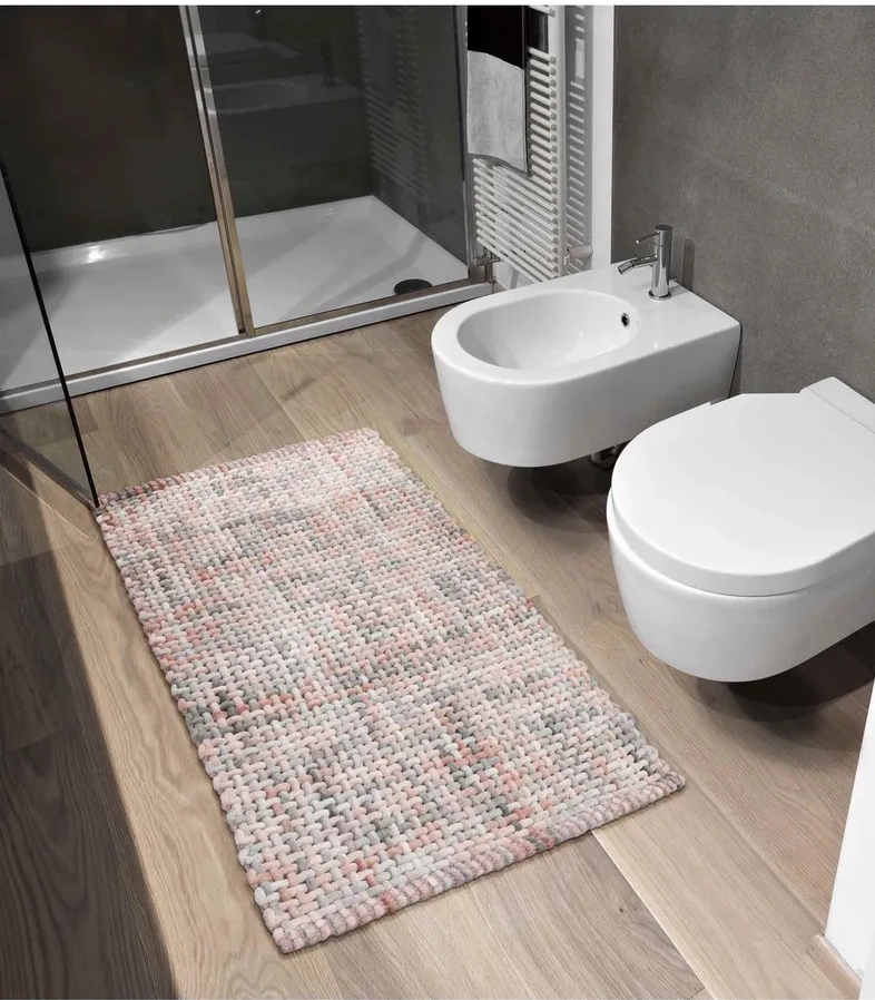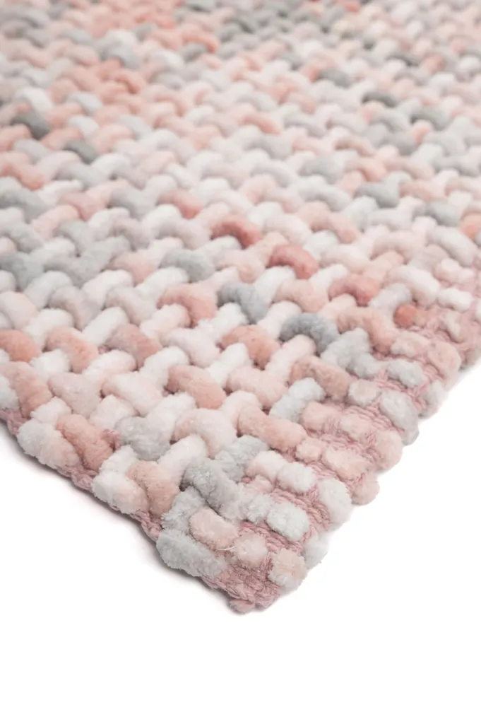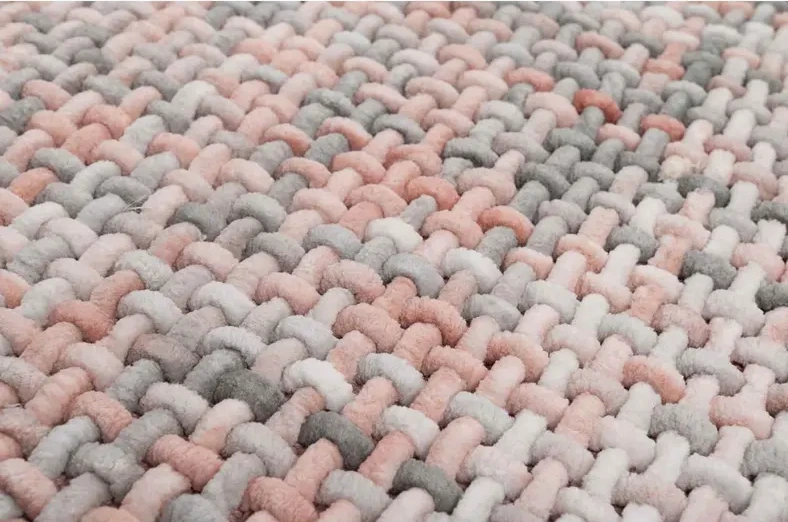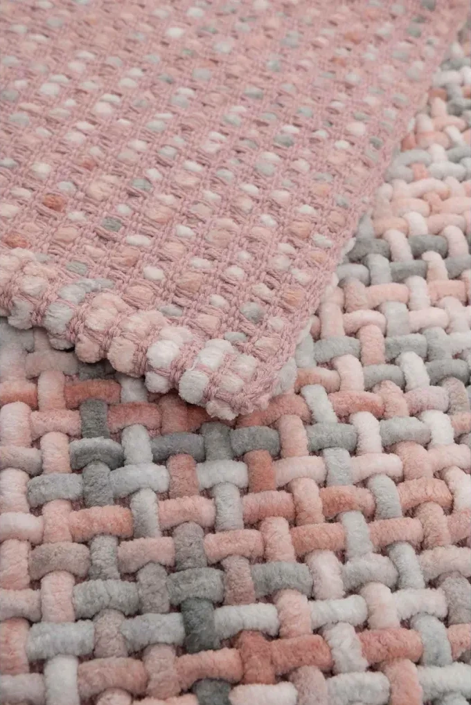 Dywanik łazienkowy w kolorze różowo-szarym, wykonany z wysokiej jakości włókna syntetycznego. Nowoczesny wzór plecionki. Produkt bezpieczny dla zdrowia i środowiska.
