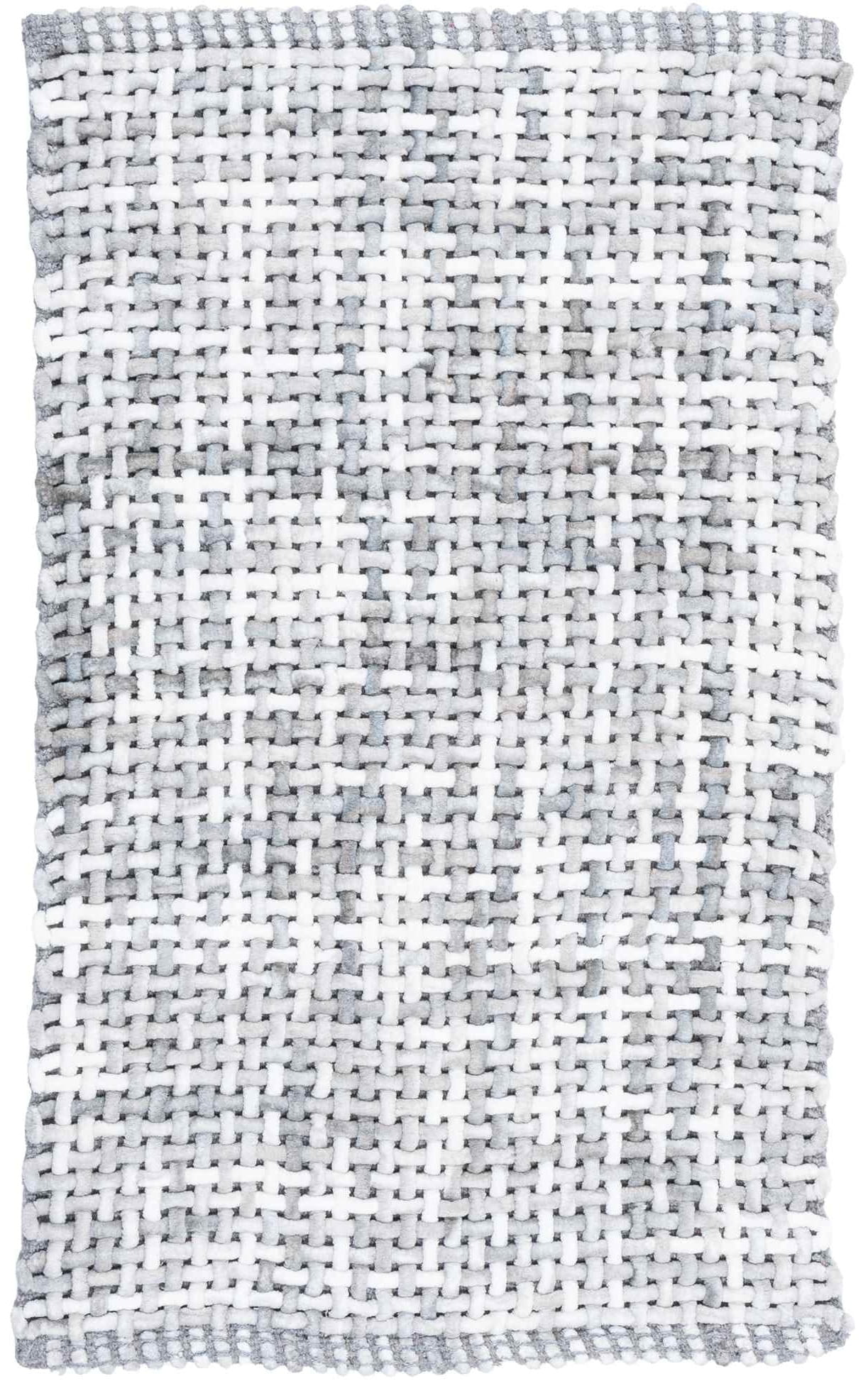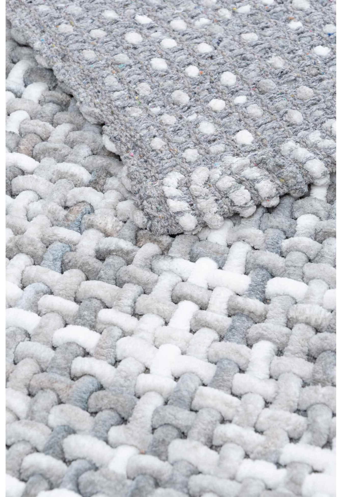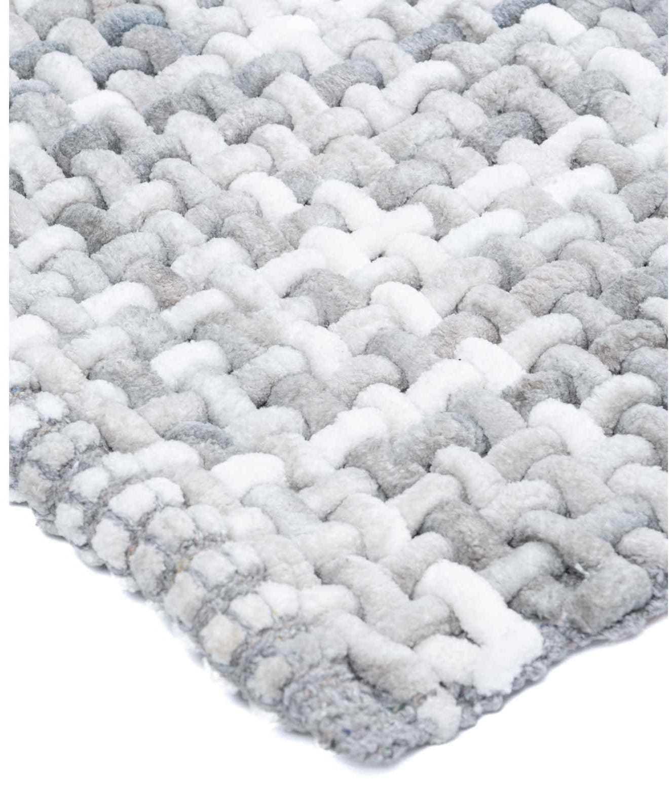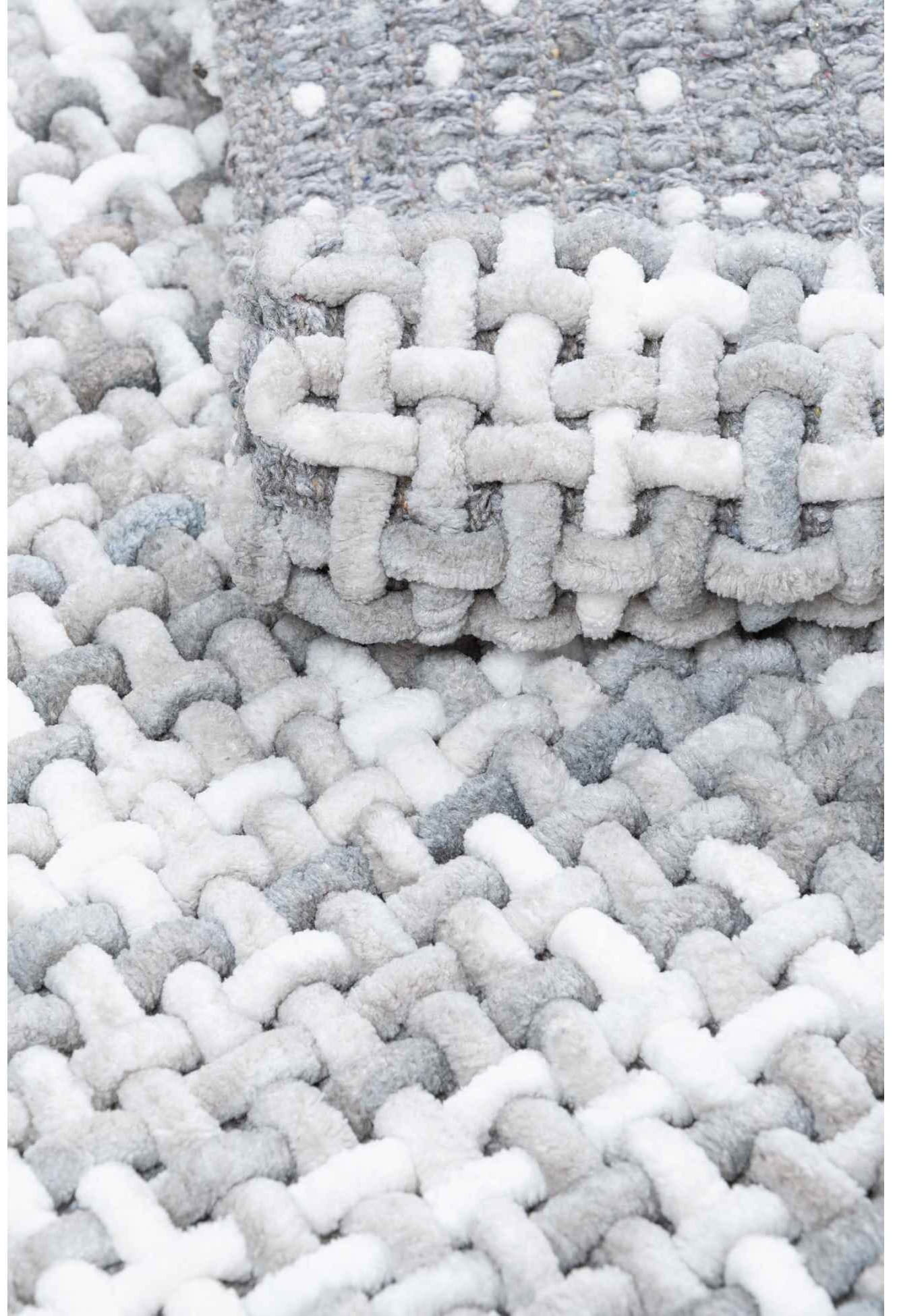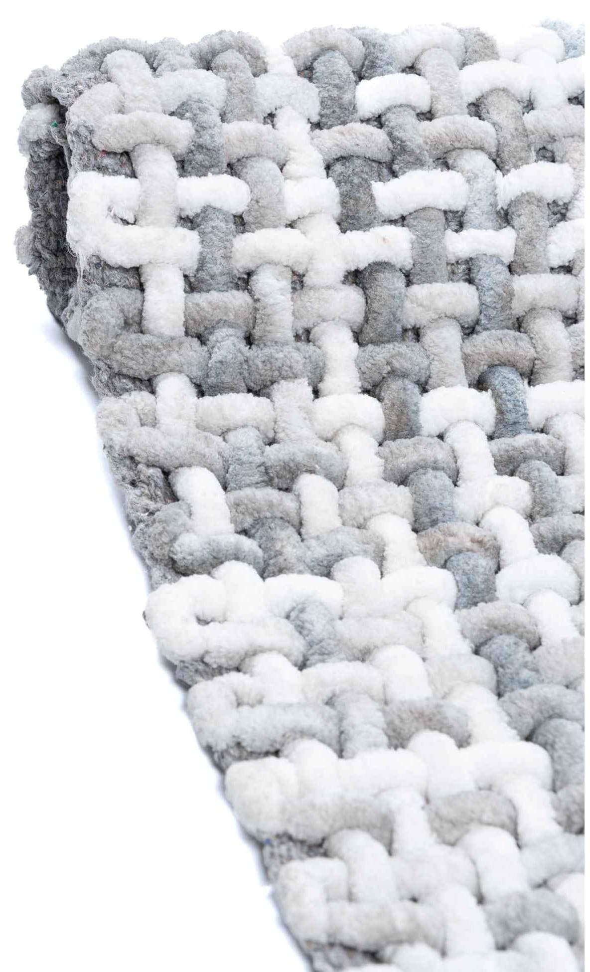 Dywanik łazienkowy w kolorze szarym, wykonany z wysokiej jakości włókna syntetycznego. Nowoczesny wzór plecionki. Produkt bezpieczny dla zdrowia i środowiska.