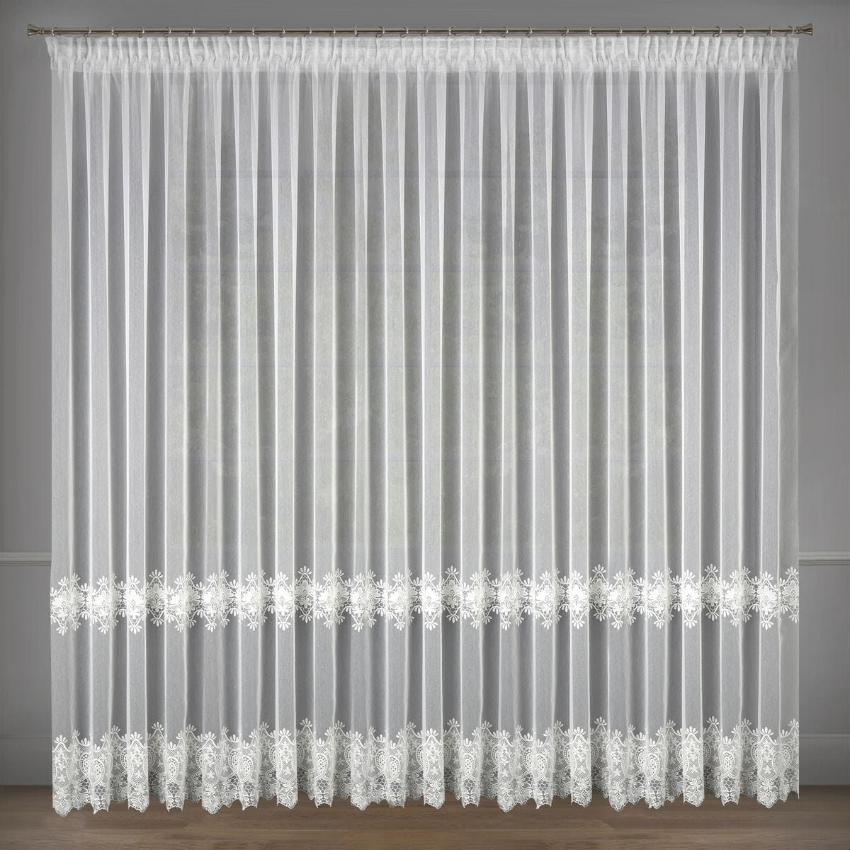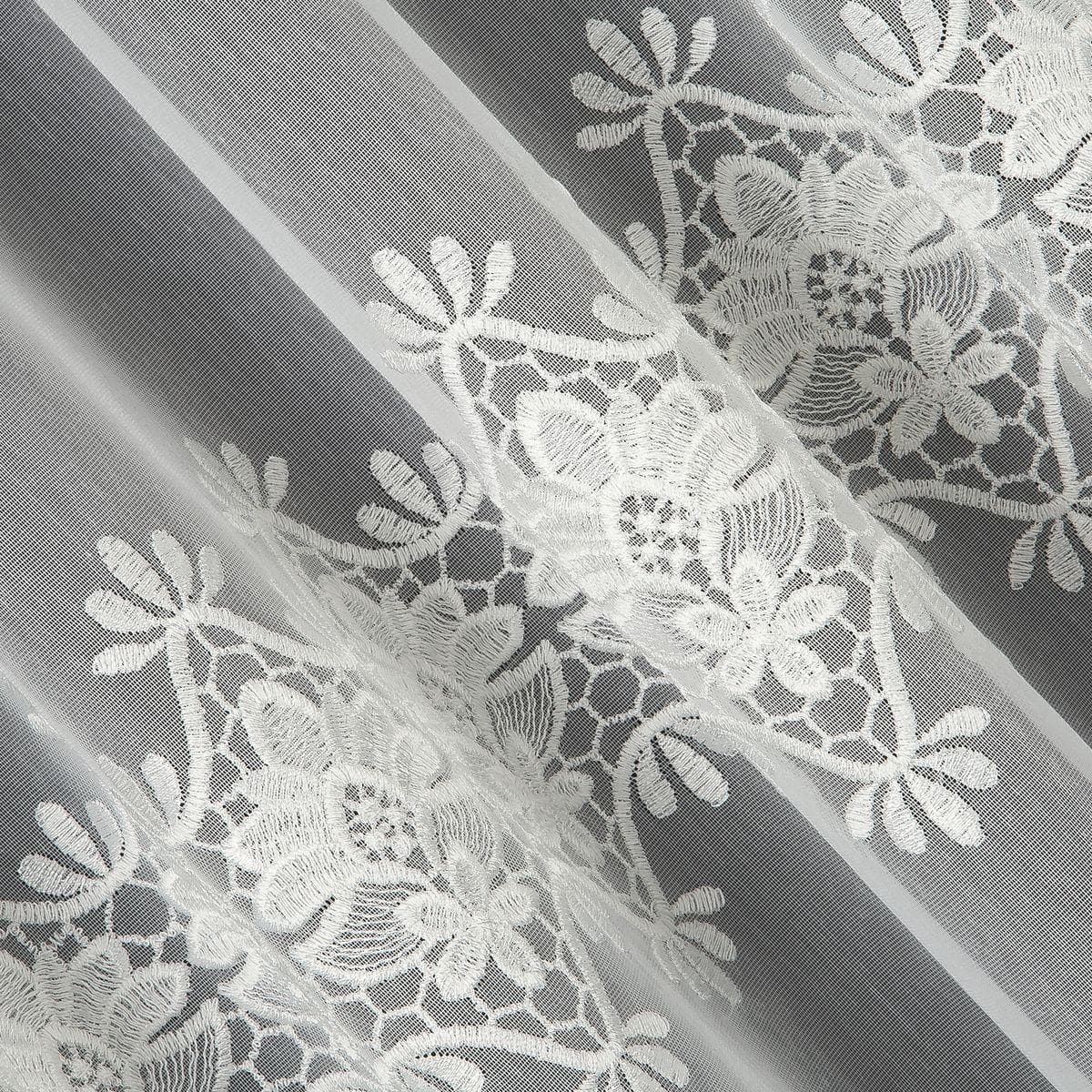 - opis ; firankę zdobi drobny abstrakcyjny haft , co dodaje jej rustykalnego charakteru. Firanka nie posiada wszytej taśmy marszczącej.