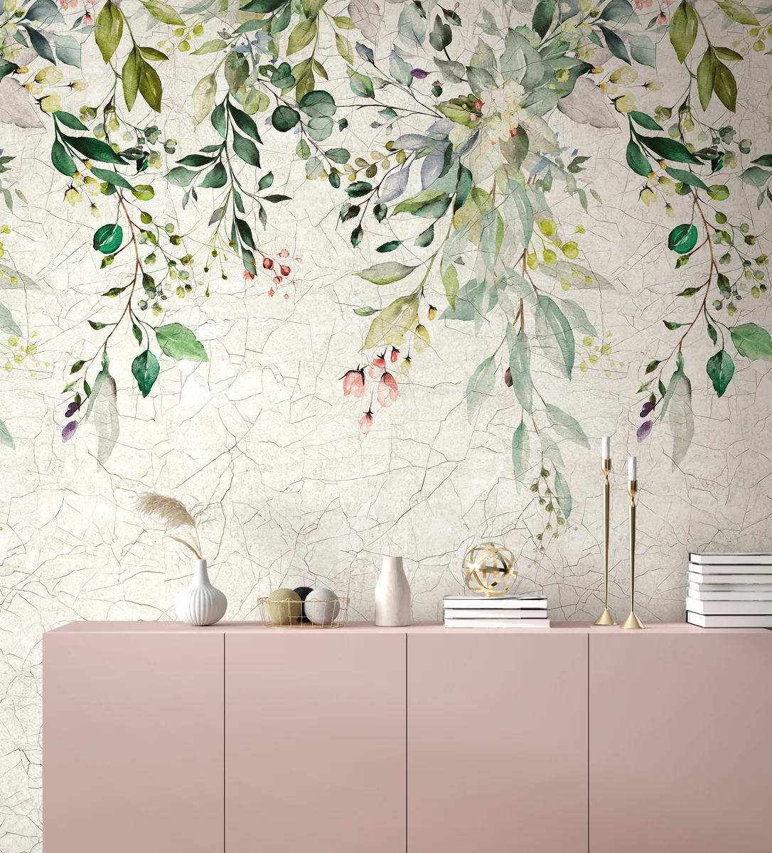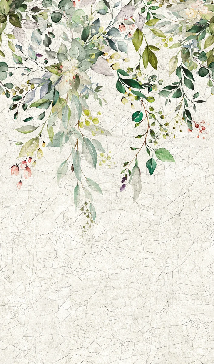 Fototapeta 42176 Marburg Oriana to delikatny, naturalistyczny motyw liści i kwiatów spływających z górnej krawędzi na tło imitujące postarzany, spękany tynk. Subtelne, akwarelowe detale i organiczny wzór wprowadzają do pomieszczenia świeżość i harmonijną atmosferę. Wykonana jest z materiałów najwyższej jakości, łatwa w aplikacji i dopracowana w każdym detalu.