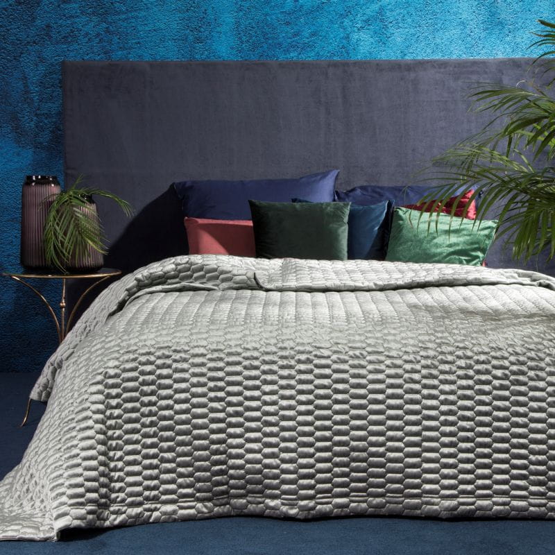 Luksusowa narzuta w srebrnym kolorze, wykonana z miękkiego i eleganckiego welwetu, który zachwyca aksamitnym wykończeniem i delikatnym połyskiem. Nowoczesne pikowanie w geometryczny wzór nadaje jej wyjątkowy charakter, a wytrzymała tkanina jest łatwa w pielęgnacji i przyjemna w dotyku.