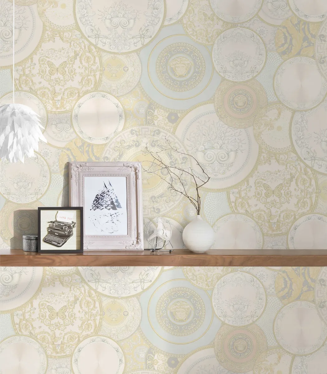 Tapeta Versace prezentuje dekoracyjny wzór inspirowany luksusową porcelaną i ornamentyką charakterystyczną dla stylu marki Versace. Bogata kompozycja talerzy z klasycznymi motywami dekoracyjnymi tworzy efekt eleganckiej galerii na ścianie i nadaje wnętrzu wyrafinowany, designerski charakter. Wykonana z materiałów najwyższej jakości, jest wyjątkowo trwała, łatwa w montażu i dopracowana w każdym detalu.