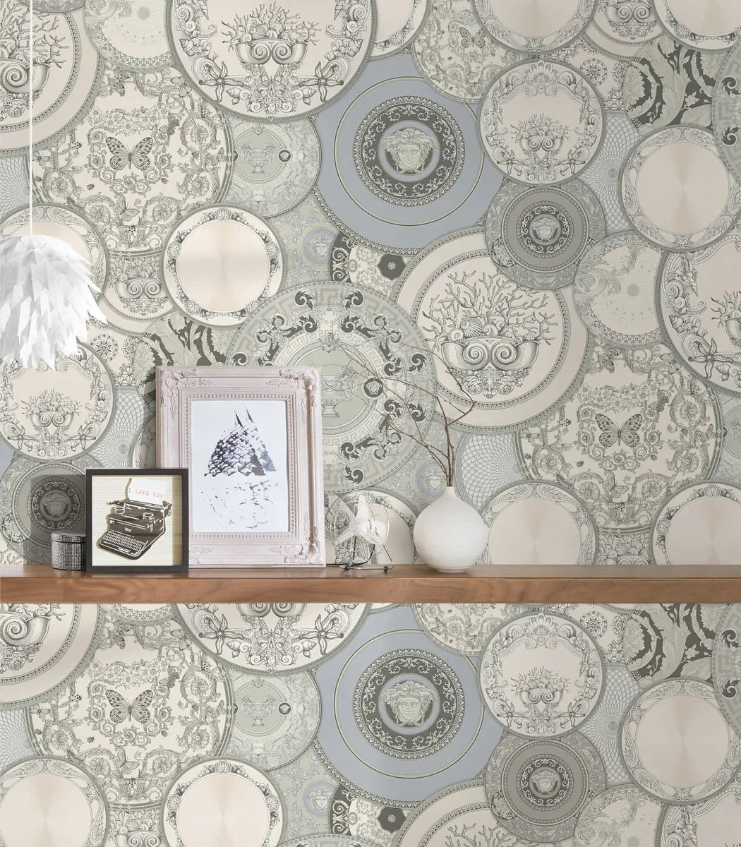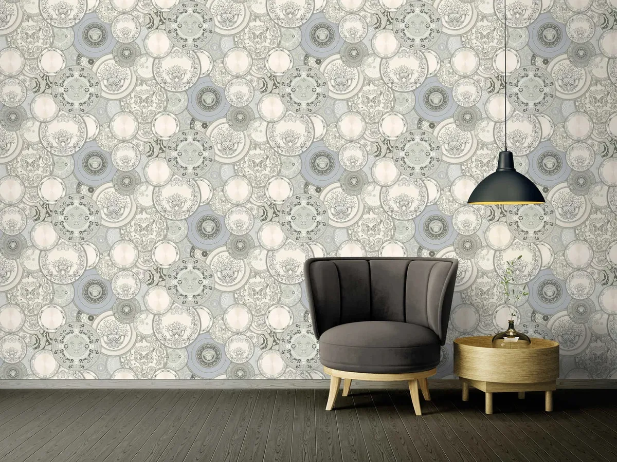 Tapeta Versace prezentuje dekoracyjny wzór inspirowany luksusową porcelaną i ornamentyką charakterystyczną dla stylu marki Versace. Bogata kompozycja talerzy z klasycznymi motywami dekoracyjnymi tworzy efekt eleganckiej galerii na ścianie i nadaje wnętrzu wyrafinowany, designerski charakter. Wykonana z materiałów najwyższej jakości, jest wyjątkowo trwała, łatwa w montażu i dopracowana w każdym detalu.