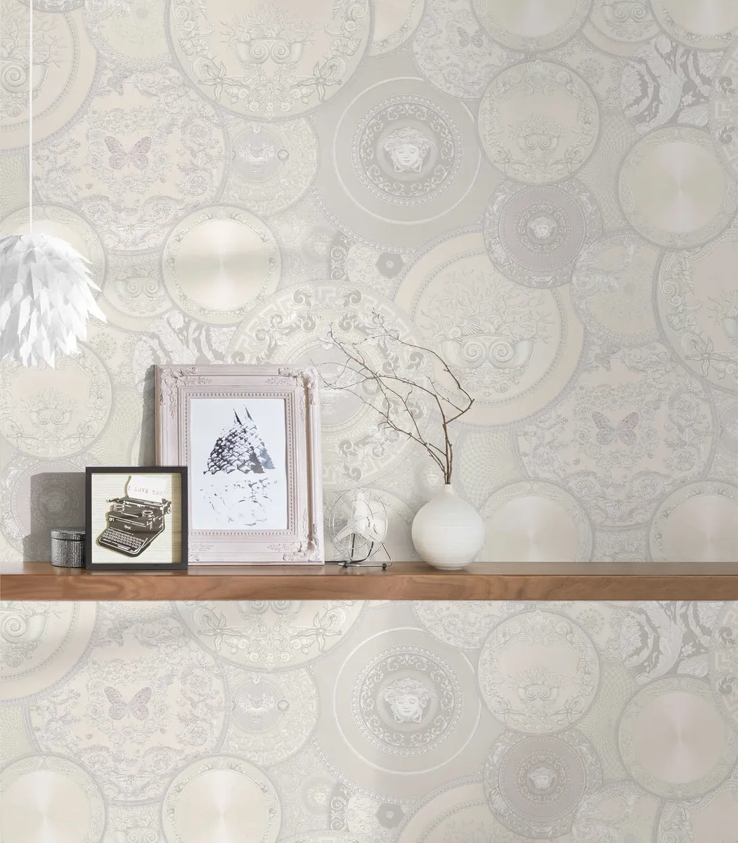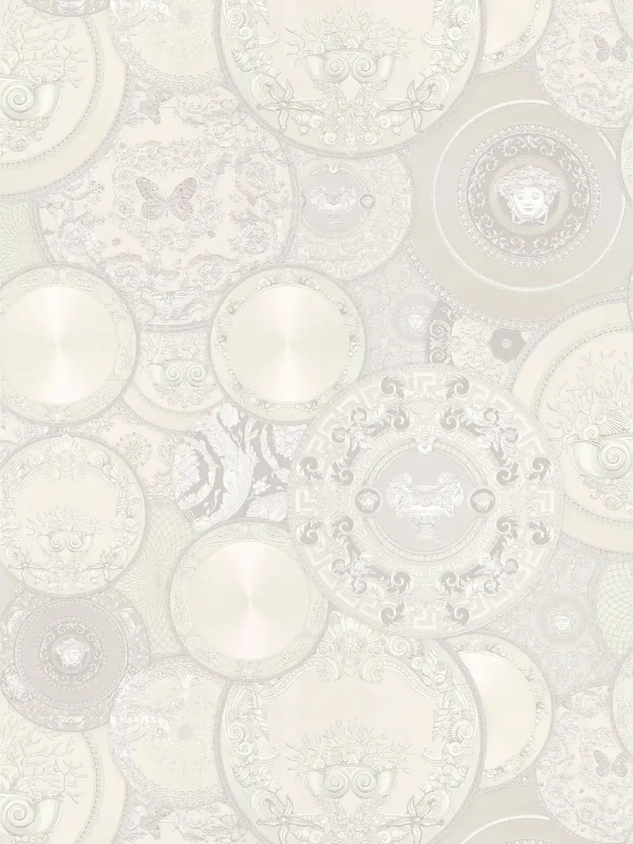 Tapeta Versace prezentuje dekoracyjny wzór inspirowany luksusową porcelaną i ornamentyką charakterystyczną dla stylu marki Versace. Bogata kompozycja talerzy z klasycznymi motywami dekoracyjnymi tworzy efekt eleganckiej galerii na ścianie i nadaje wnętrzu wyrafinowany, designerski charakter. Wykonana z materiałów najwyższej jakości, jest wyjątkowo trwała, łatwa w montażu i dopracowana w każdym detalu.