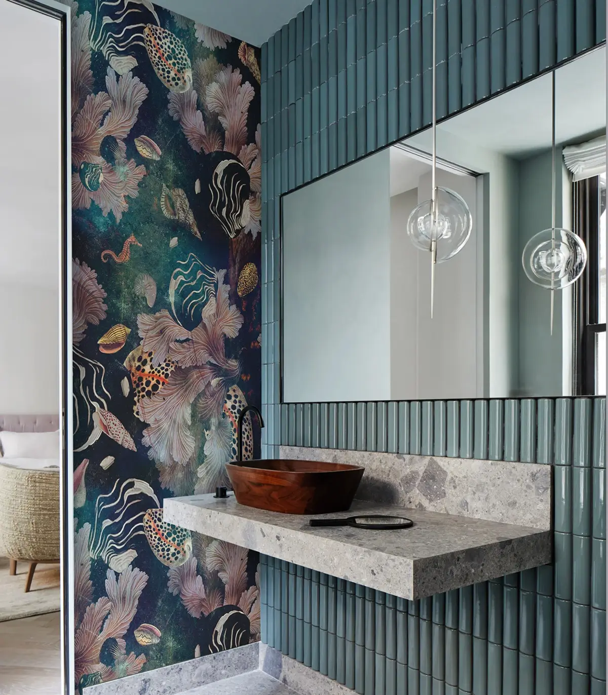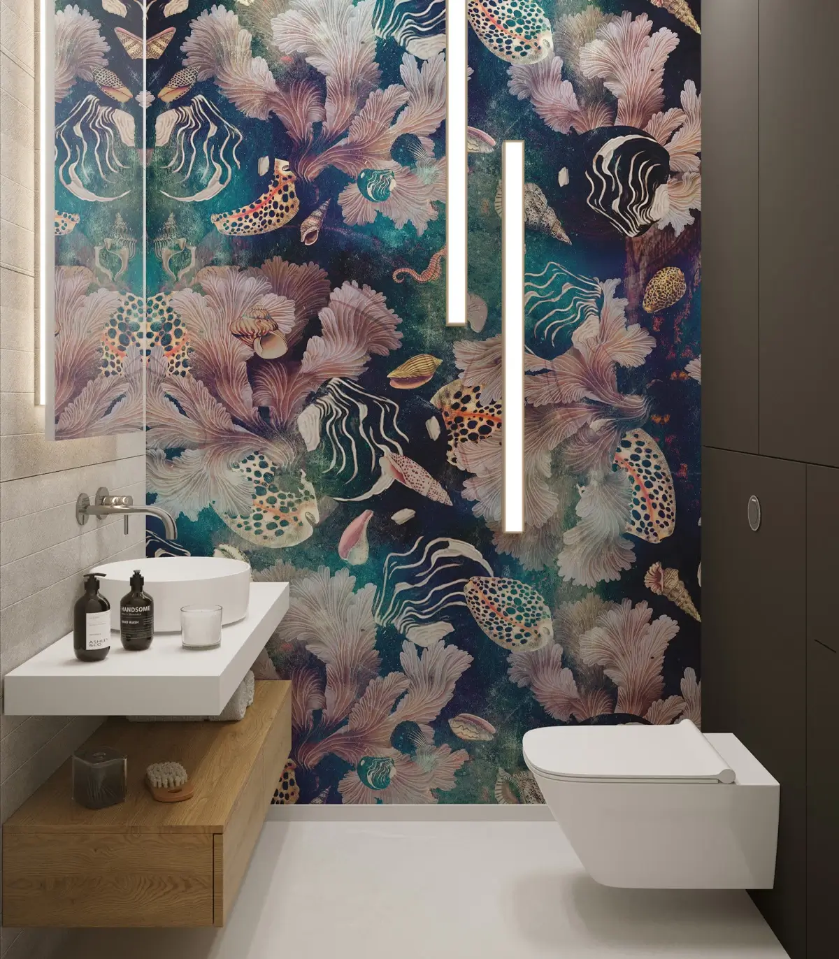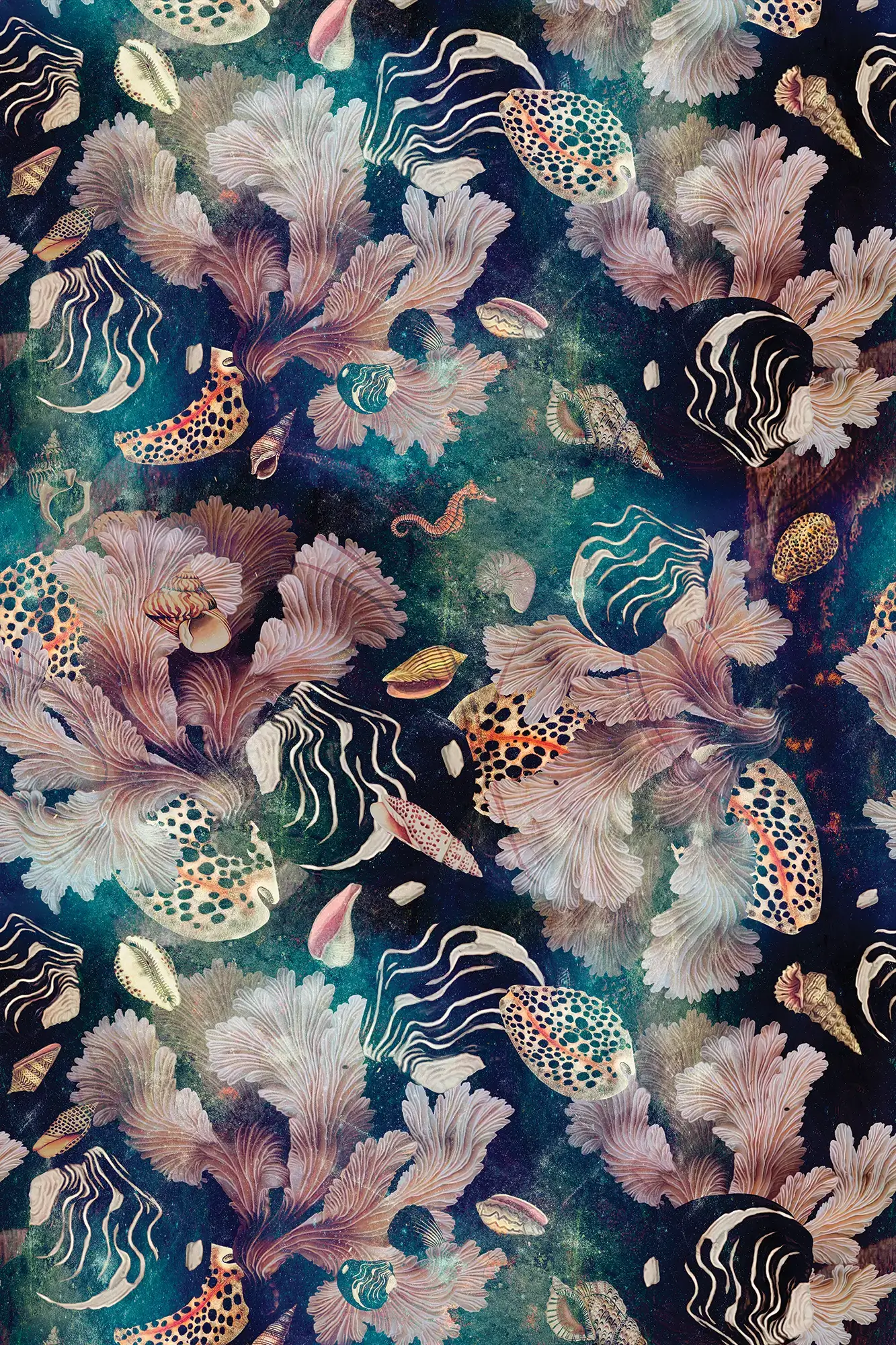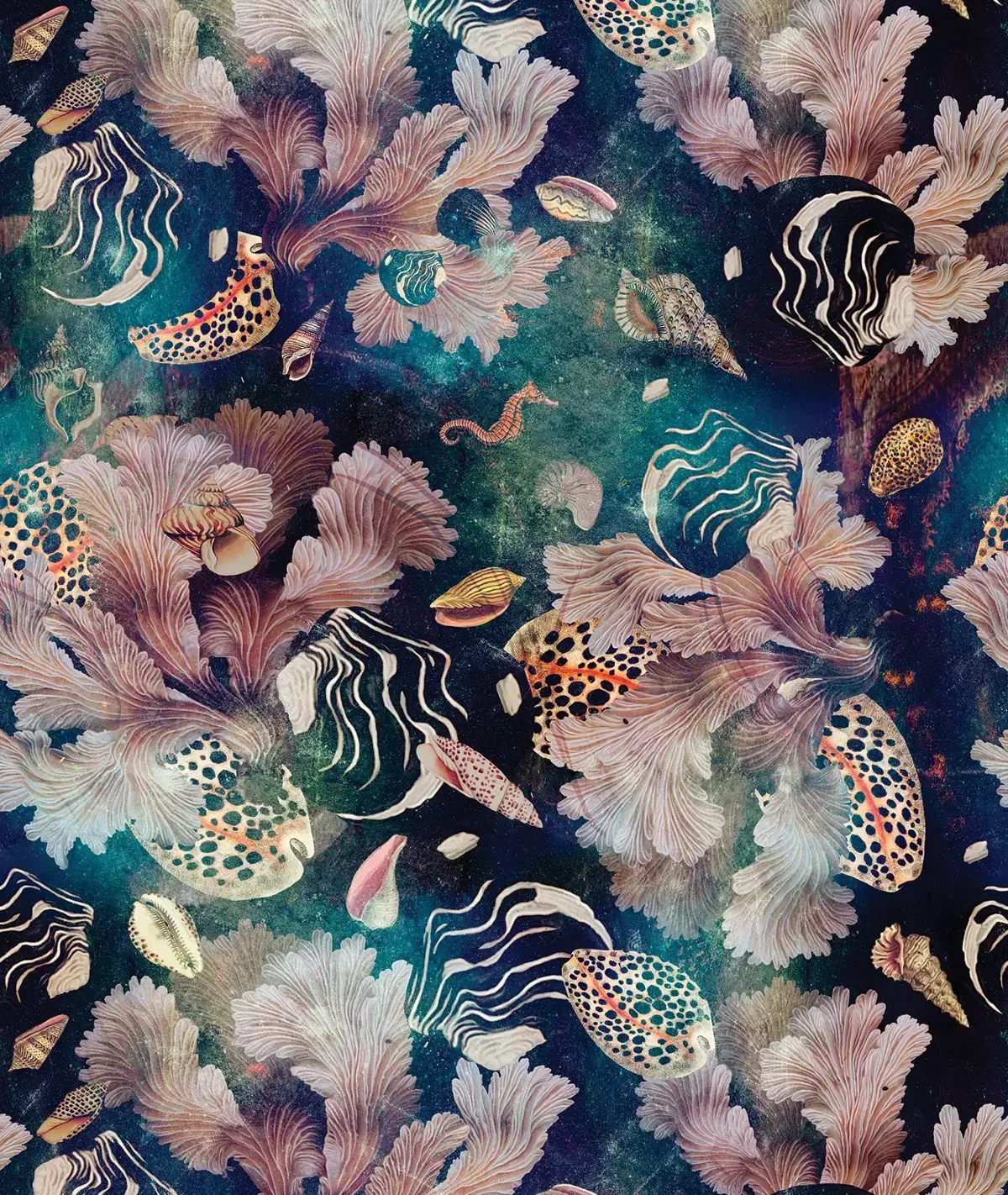 Tapeta zachwyca artystycznym połączeniem morskich motywów w pastelowych kolorach i głębokich odcieniach granatu. Ten designerski wzór wprowadza do wnętrza nutę luksusu i tajemniczej głębi morskiego świata. Wysokiej jakości materiał zapewnia trwałość, łatwy montaż oraz perfekcyjne wykończenie.