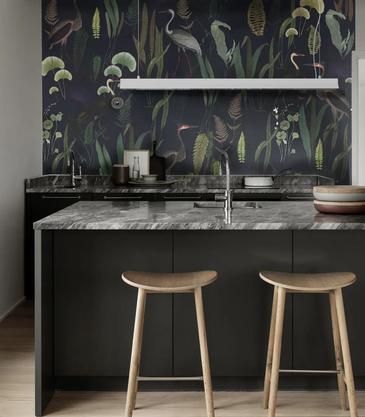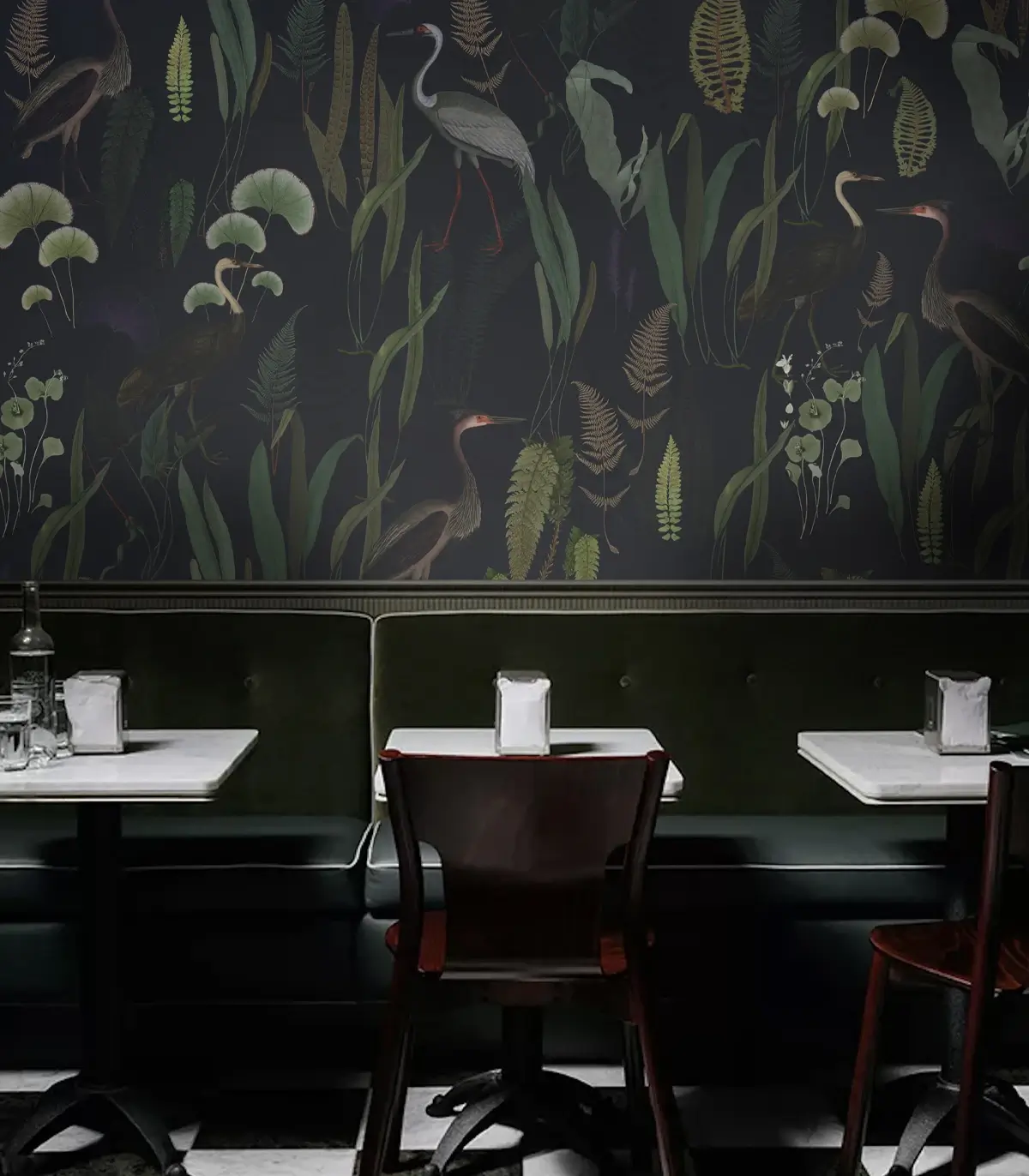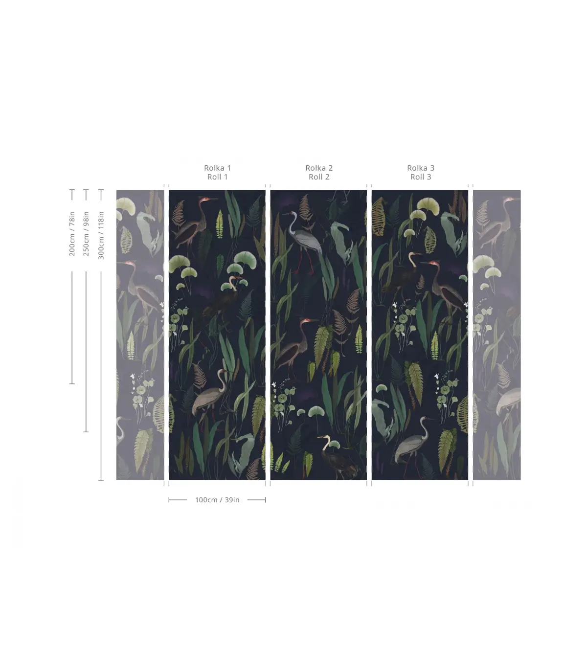 Urocza tapeta w kolorze granatowym, z motywami roślinnymi, wśród których majestatycznie przechadzają się czaple. Spokojna przyrodnicza estetyka wprowadza do wnętrza harmonię i naturalną elegancję, idealną dla miłośników tapet z motywem ptaków i roślin. Wysokiej jakości, starannie dobrany materiał gwarantuje trwałość, łatwy montaż i perfekcyjne wykończenie.