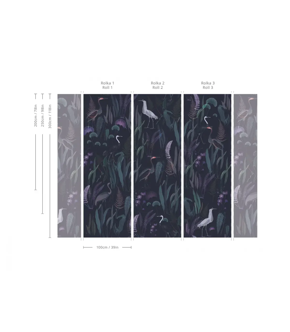 Urocza tapeta w kolorze ciemno fioletowym, z motywami roślinnymi, wśród których majestatycznie przechadzają się czaple. Spokojna przyrodnicza estetyka wprowadza do wnętrza harmonię i naturalną elegancję, idealną dla miłośników tapet z motywem ptaków i roślin. Wysokiej jakości, starannie dobrany materiał gwarantuje trwałość, łatwy montaż i perfekcyjne wykończenie.