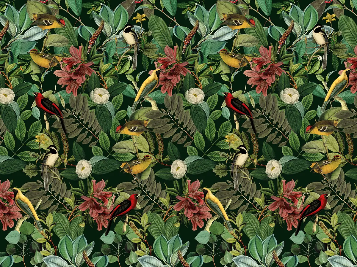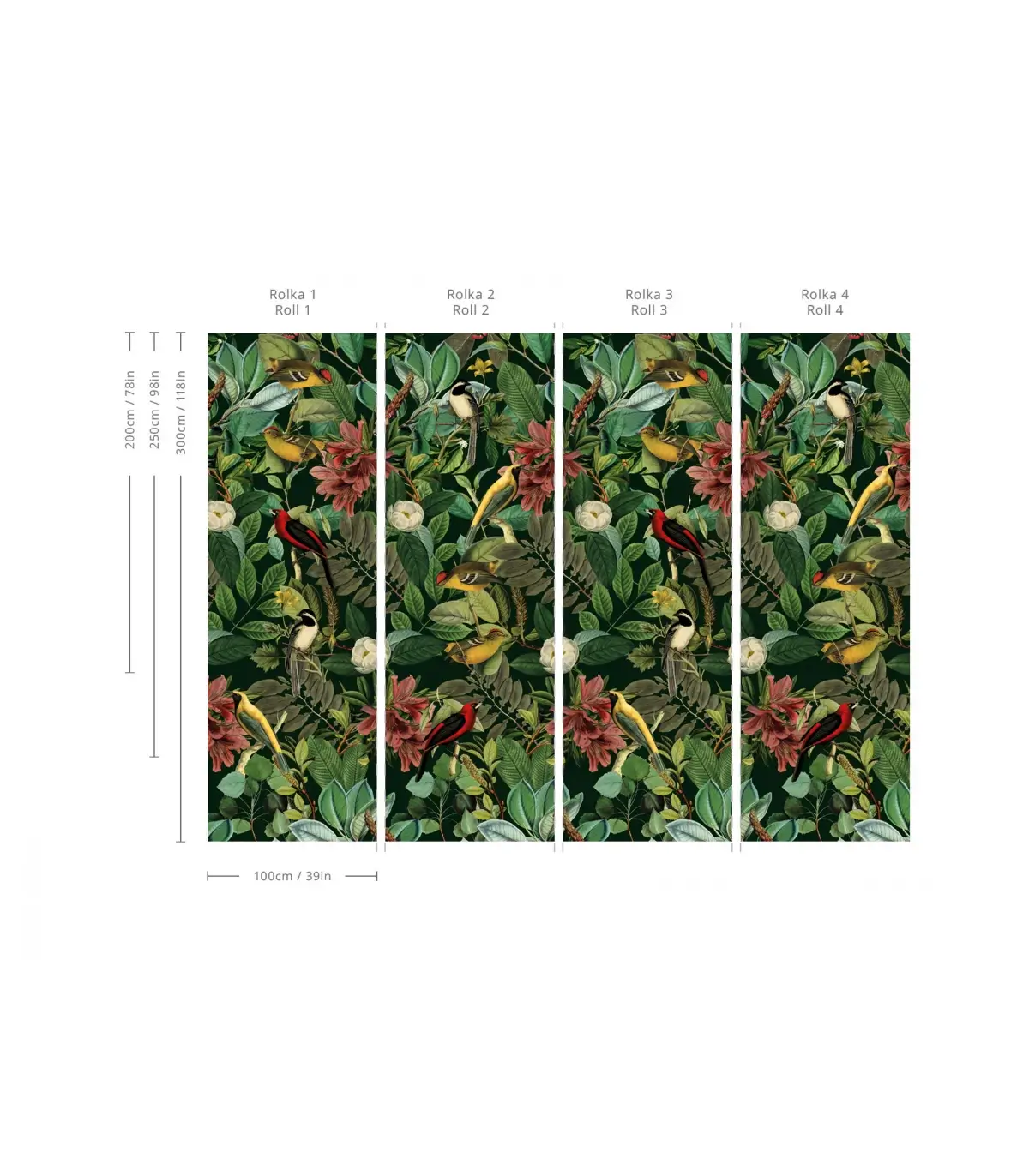 Luksusowa tapeta ścienna w klimacie tropikalnej dżungli, łączy głęboką butelkową zieleń z realistycznymi ilustracjami ptaków i bujnej roślinności. To idealna propozycja dla osób, które szukają wyrazistego akcentu inspirowanego naturą. Starannie dobrany materiał zapewnia trwałość, łatwość montażu oraz estetyczne wykończenie.