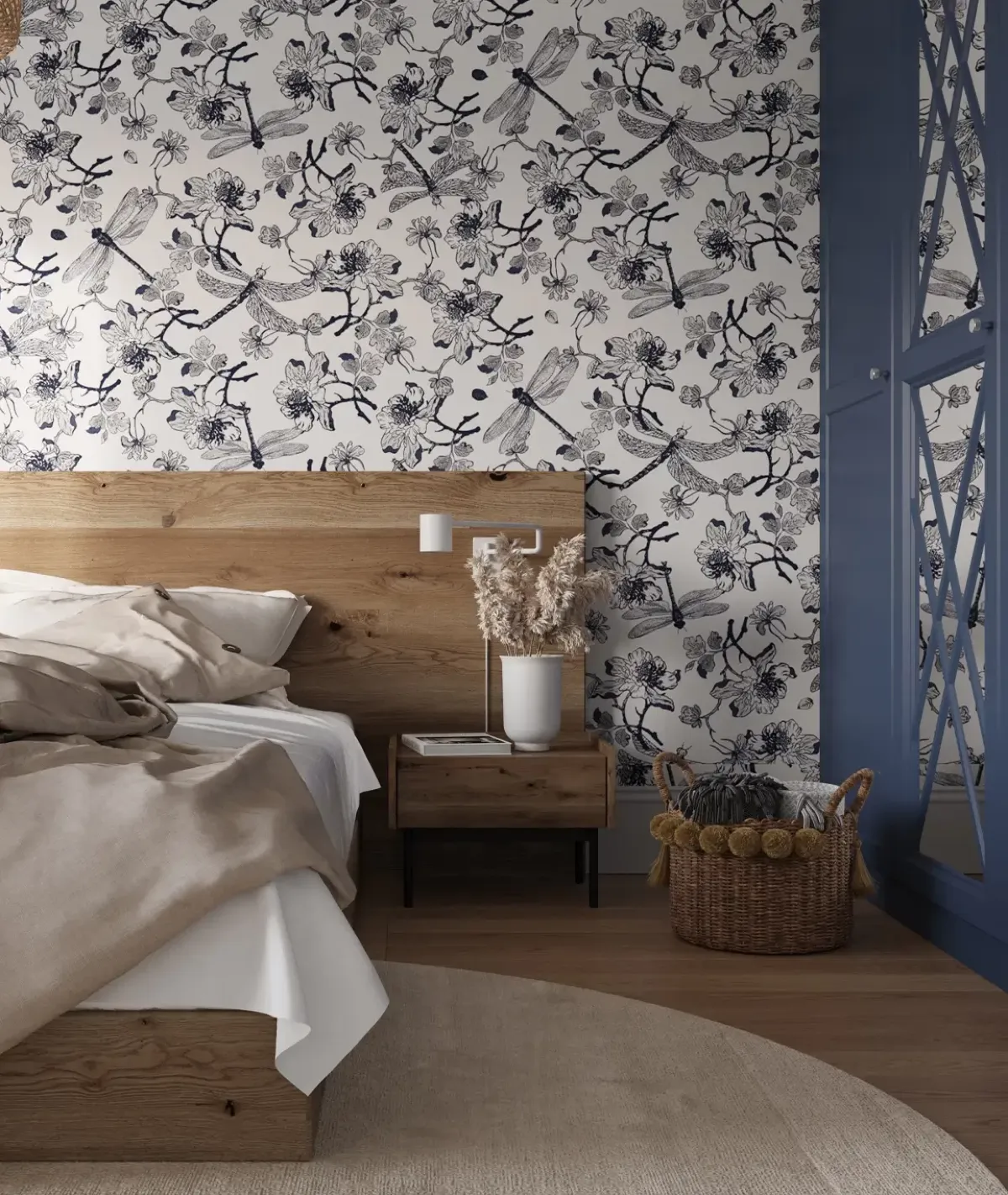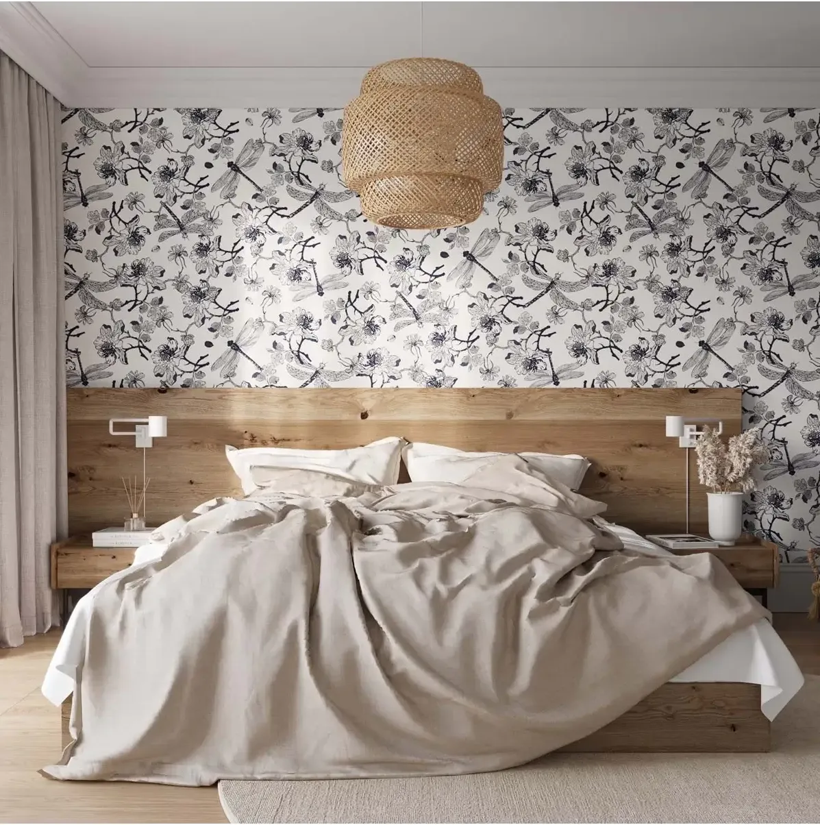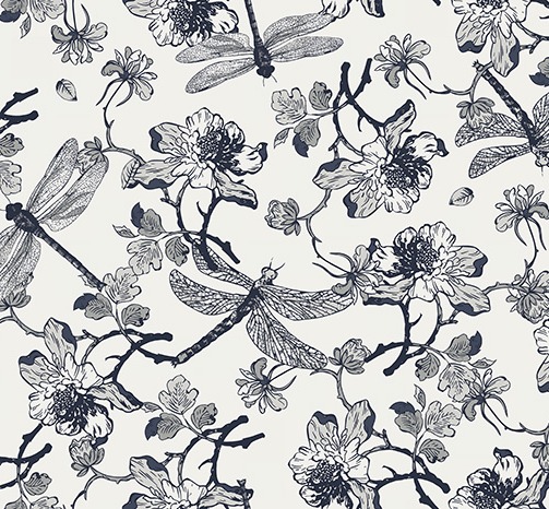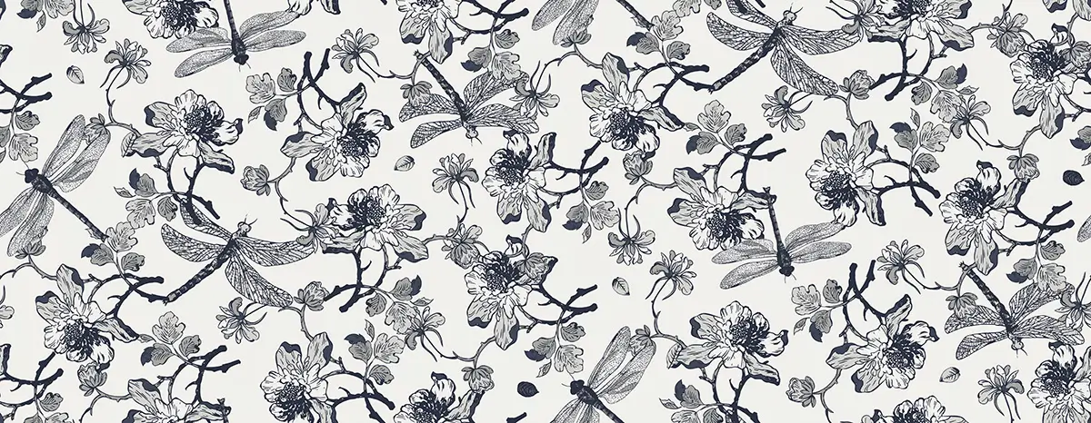 Tapeta ścienna z subtelnym, artystycznym wzorem kwitnących gałązek oraz ważek, utrzymana w stylu rysunkowej ilustracji. Wyrazisty, kontrastowy motyw nadaje powierzchni elegancki, botaniczny charakter. Wykonana jest z trwałego materiału, łatwa w montażu, odporna na codzienne użytkowanie i starannie wykończona.
