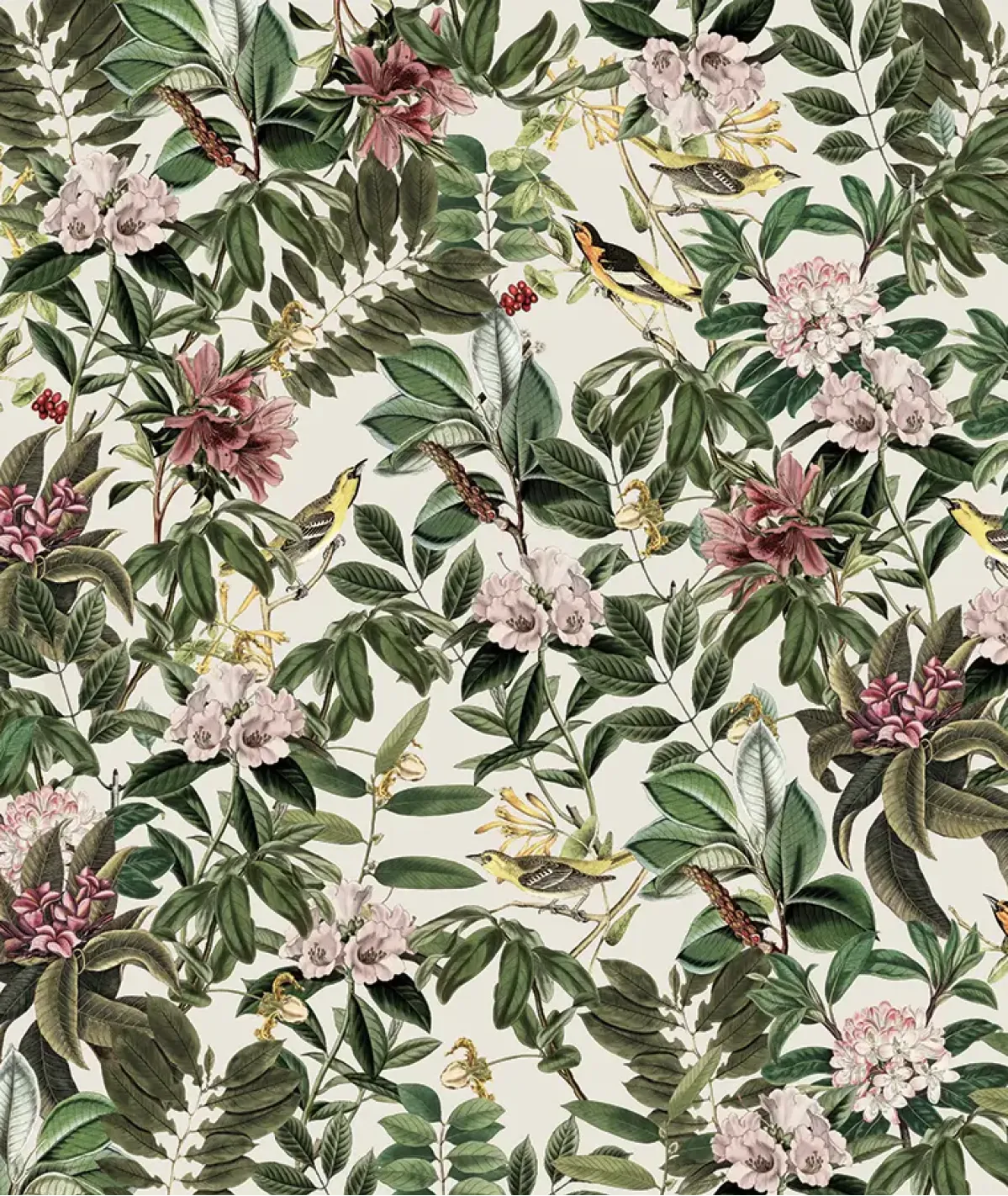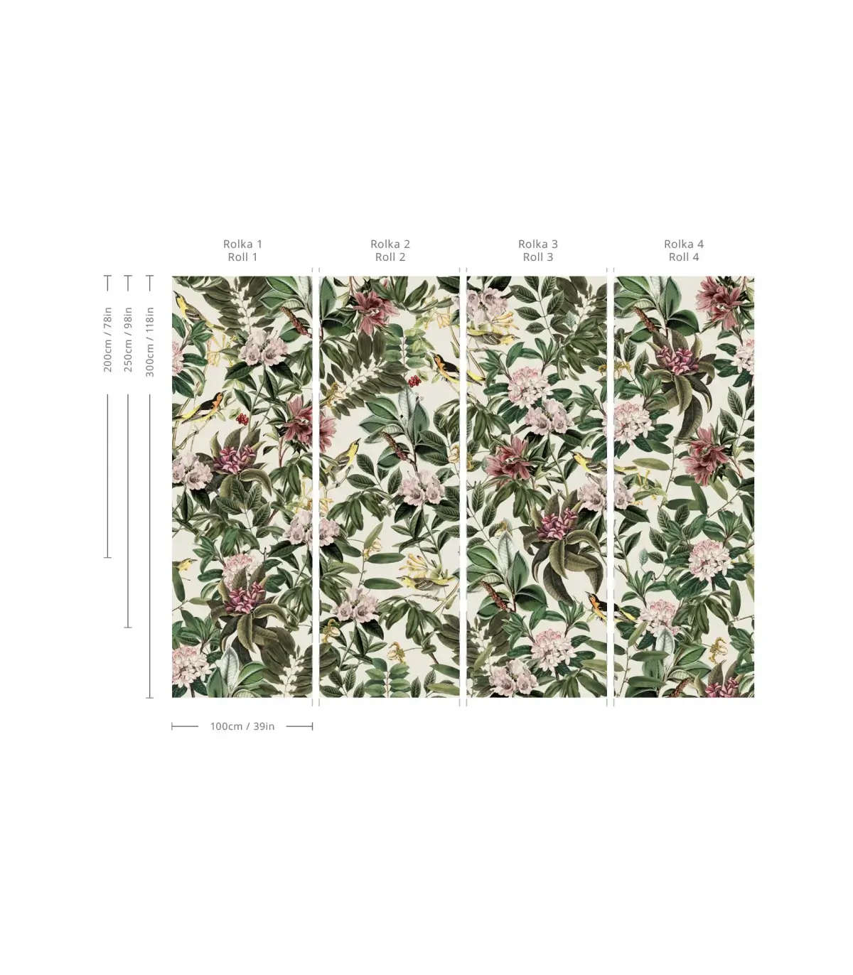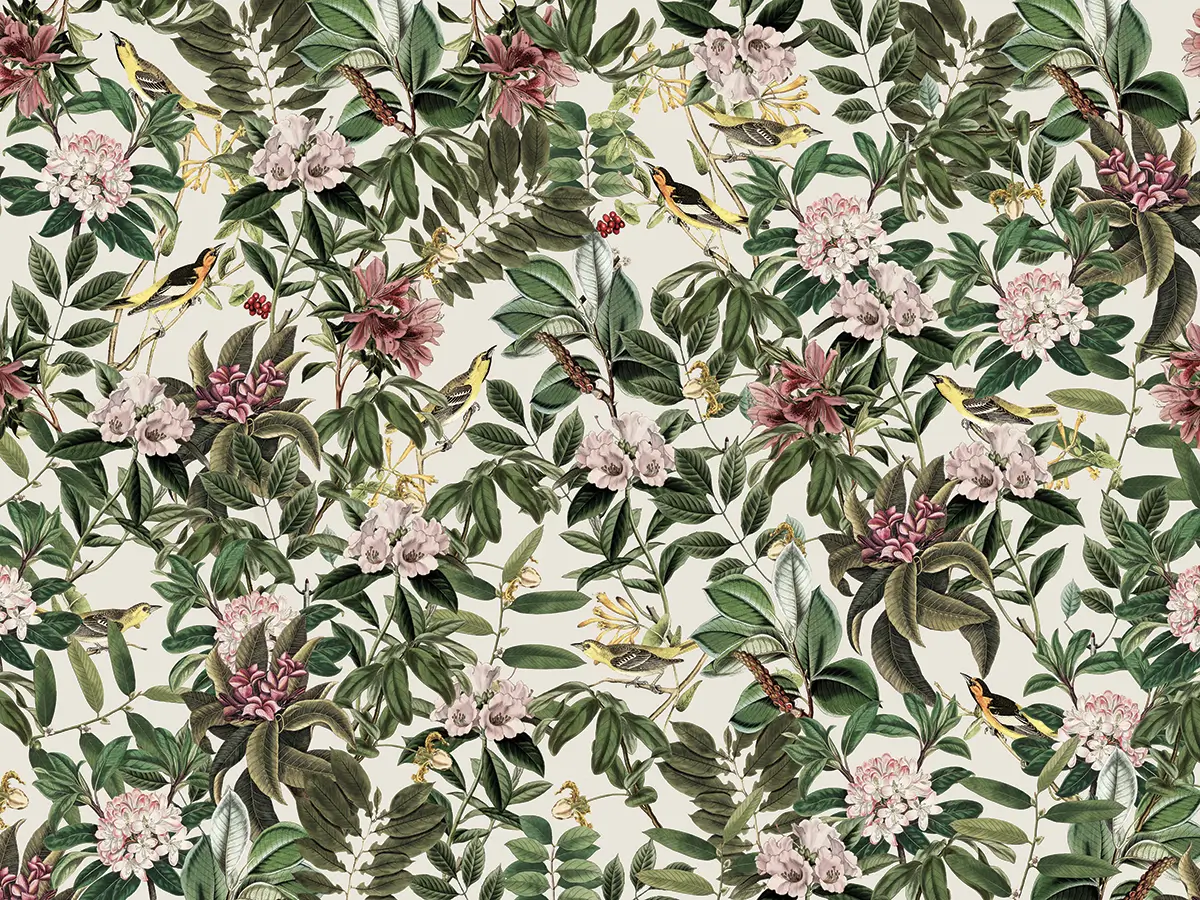 Tapeta ścienna utrzymana w stylu botanicznym, z efektownym bujnym wzorem tropikalnych liści, kwiatów i ptaków w odcieniach zieleni, różu i kremowej bieli. Wykonana jest z wysokiej jakości materiału, cechuje się trwałością, łatwym montażem i starannym wykończeniem.
