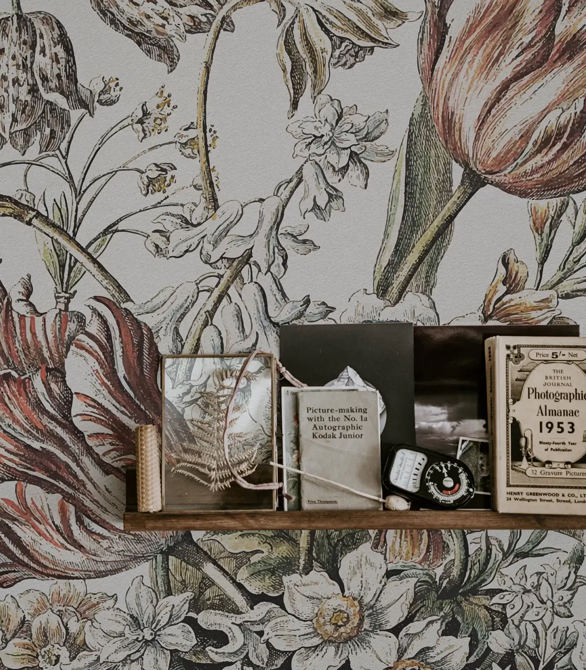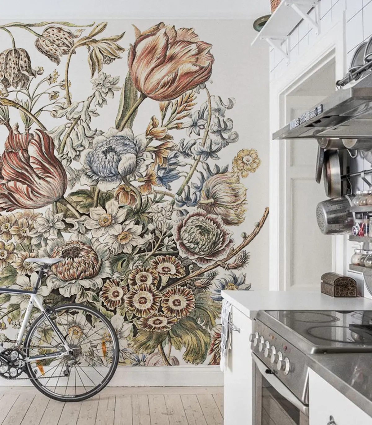 Tapeta ścienna z artystycznym, stylizowanym na ryciny botanicznym wzorem kwiatowym stanowi efektowną i elegancką dekorację ścienną. Wykonana z wysokiej jakości materiałów, cechuje się trwałością, prostym montażem oraz precyzyjnym wykończeniem.