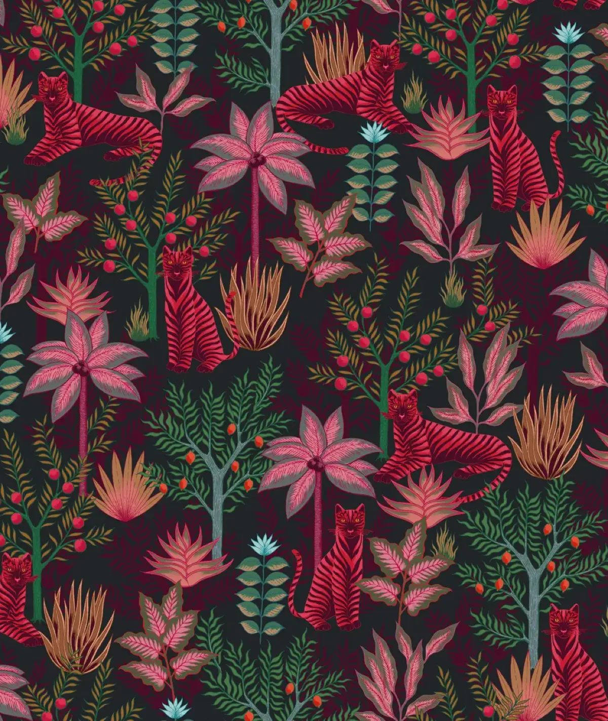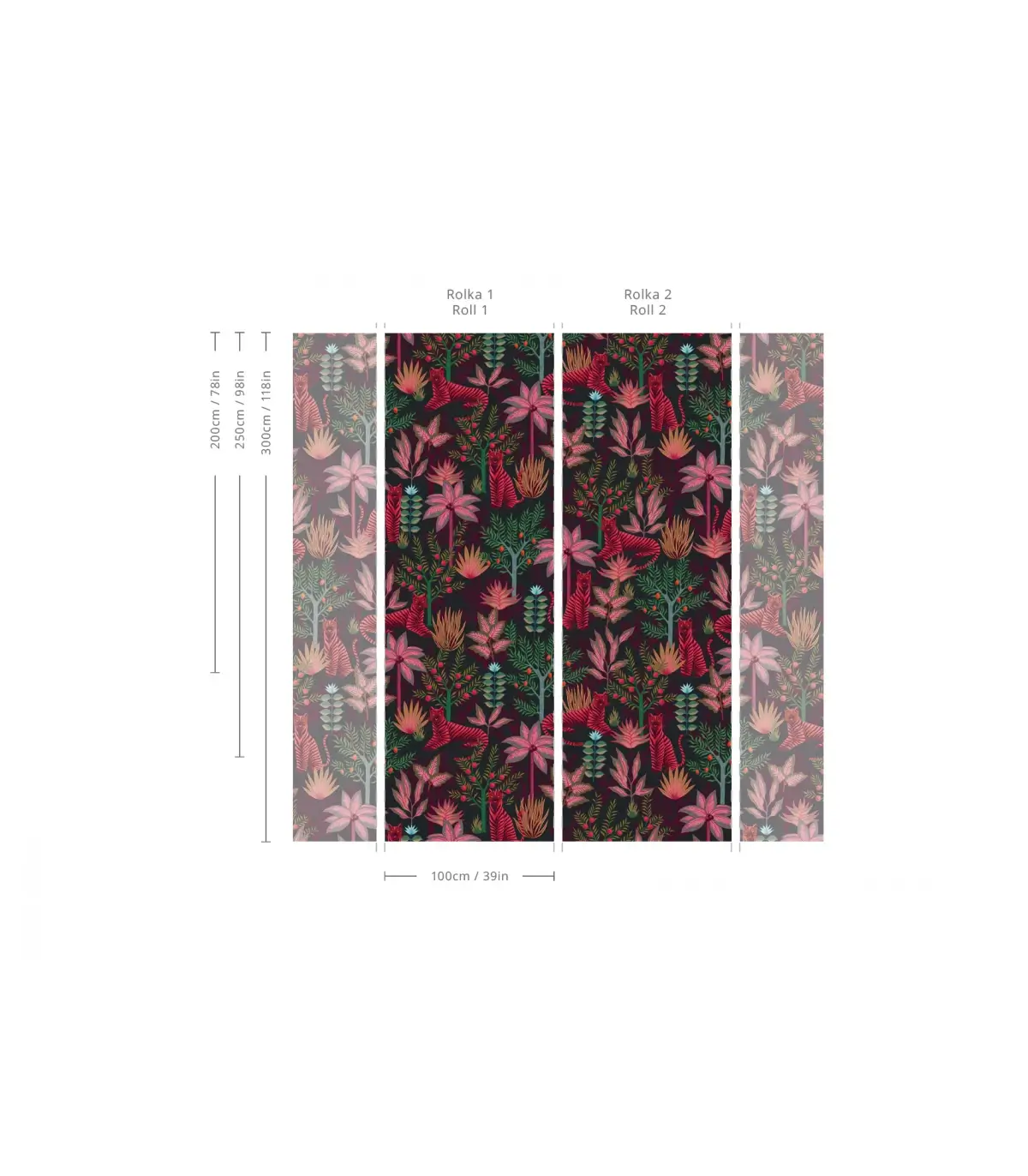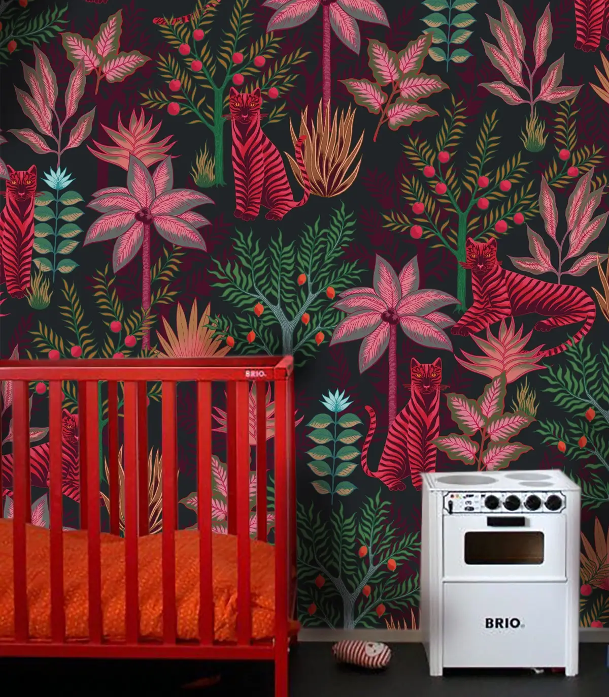 Kolorowa tapeta z czarnym tłem i motywem czerwonych tygrysów w egzotycznej dżungli wprowadza odważny, bajkowy akcent do wnętrz. Świetnie sprawdzi się zarówno w pokojach dziecięcych, młodzieżowych, sypialniach czy nawet w salonie, łazience i kuchni. Starannie dobrany, wysokiej jakości materiał zapewnia trwałość, łatwy montaż i estetyczne wykończenie.