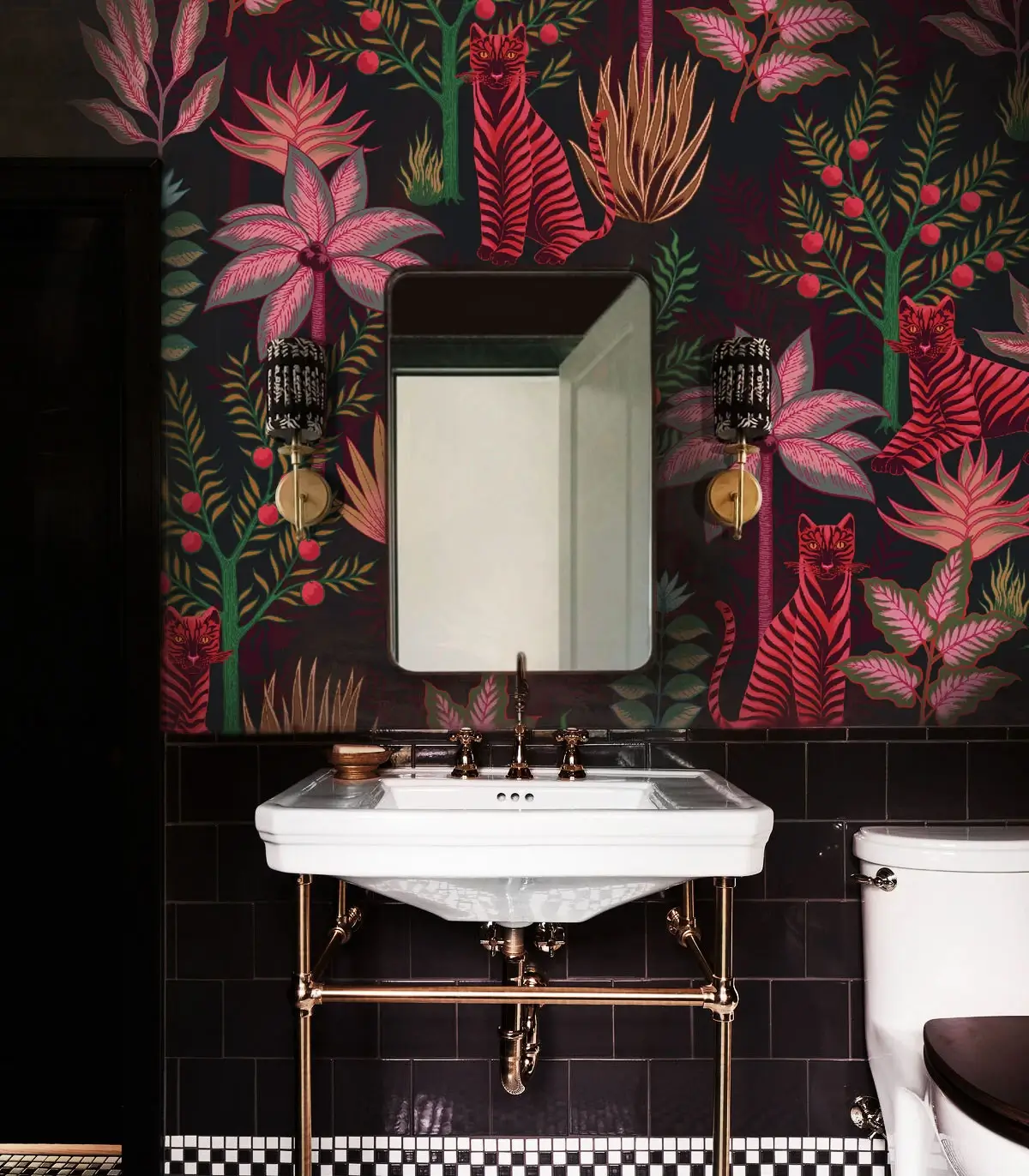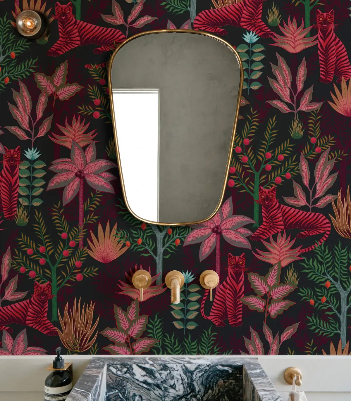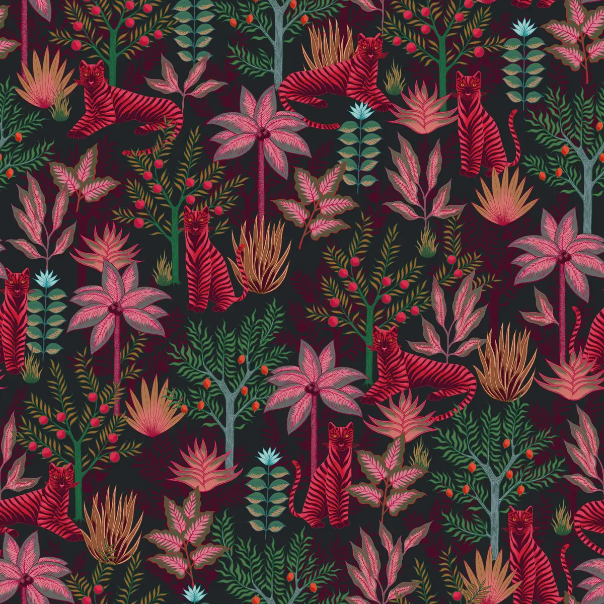 Kolorowa tapeta z czarnym tłem i motywem czerwonych tygrysów w egzotycznej dżungli wprowadza odważny, bajkowy akcent do wnętrz. Świetnie sprawdzi się zarówno w pokojach dziecięcych, młodzieżowych, sypialniach czy nawet w salonie, łazience i kuchni. Starannie dobrany, wysokiej jakości materiał zapewnia trwałość, łatwy montaż i estetyczne wykończenie.