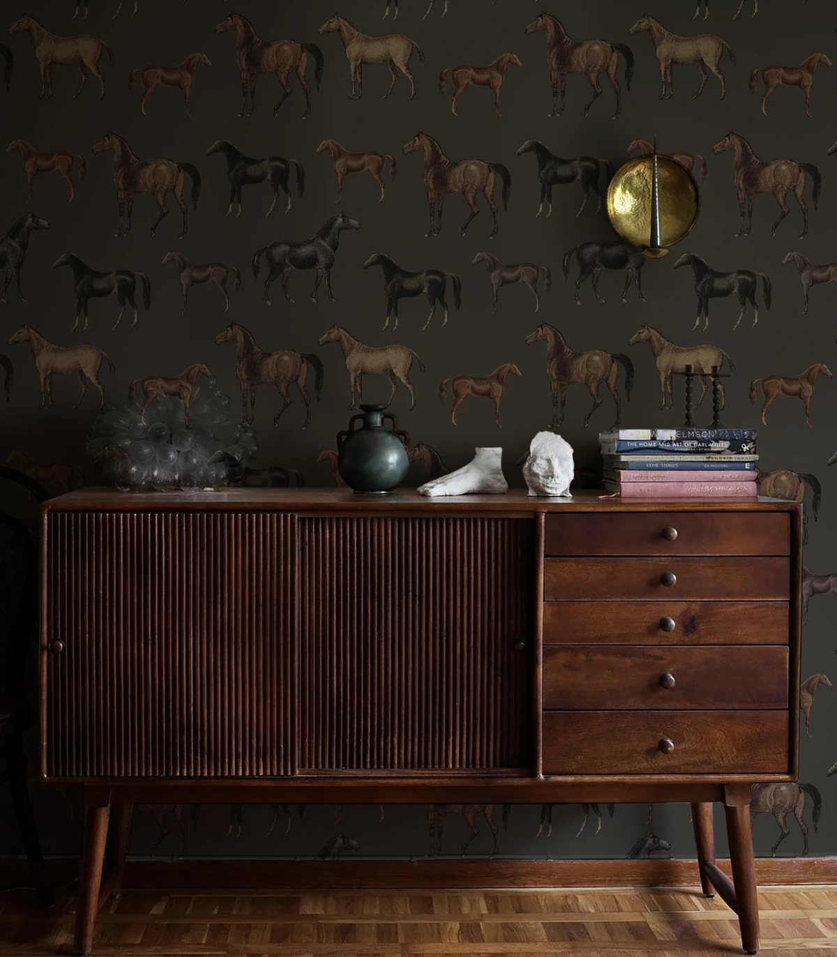 Stylowa tapeta z pięknymi ilustracyjnymi sylwetkami koni na oliwkowo-zielonym tle, utrzymana w stylu retro, sprawdzi się zarówno w klasycznych, jak i nowoczesnych aranżacjach. Wysokiej jakości materiał zapewnia trwałość, łatwy montaż oraz perfekcyjne wykończenie.